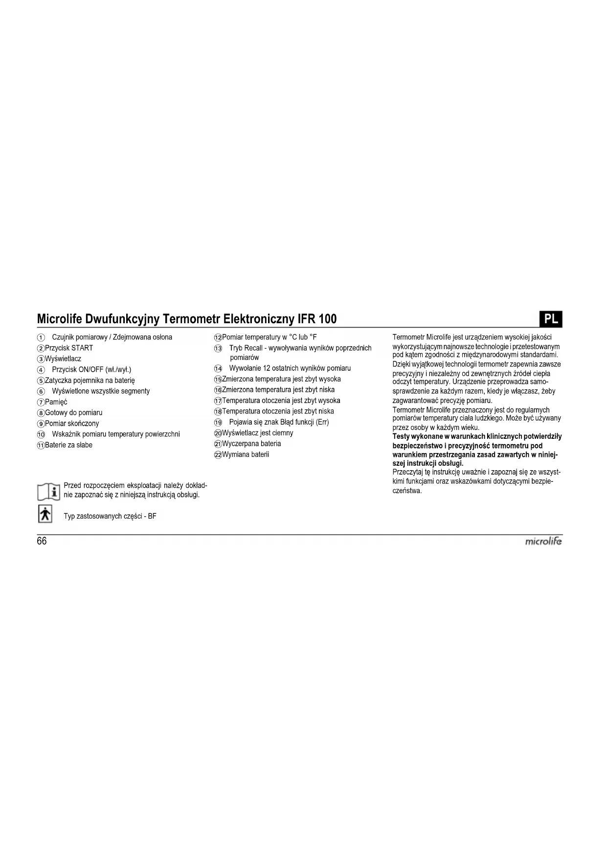 Przed rozpoczęciem eksploatacji należy dokład- nie zapoznać się z niniejszą instrukcją obsługi. Typ zastosowanych części - BF Termometr Microlife jest urządzeniem wysokiej jakości wykorzystującym najnowsze technologie i przetestowanym pod kątem zgodności z międzynarodowymi standardami. Dzięki wyjątkowej technologii termometr zapewnia zawsze precyzyjny i niezależny od zewnętrznych źródeł ciepła odczyt temperatury. Urządzenie przeprowadza samo- sprawdzenie za każdym razem, kiedy je włączasz, żeby zagwarantować precyzję pomiaru. Termometr Microlife przeznaczony jest do regularnych pomiarów temperatury ciała ludzkiego. Może być używany przez osoby w każdym wieku. Testy wykonane w warunkach klinicznych potwierdziły bezpieczeństwo i precyzyjność termometru pod warunkiem przestrzegania zasad zawartych w niniej- szej instrukcji obsługi. Przeczytaj tę instrukcję uważnie i zapoznaj się ze wszyst- kimi funkcjami oraz wskazówkami dotyczącymi bezpie- czeństwa. Microlife Dwufunkcyjny Termometr Elektroniczny IFR 100