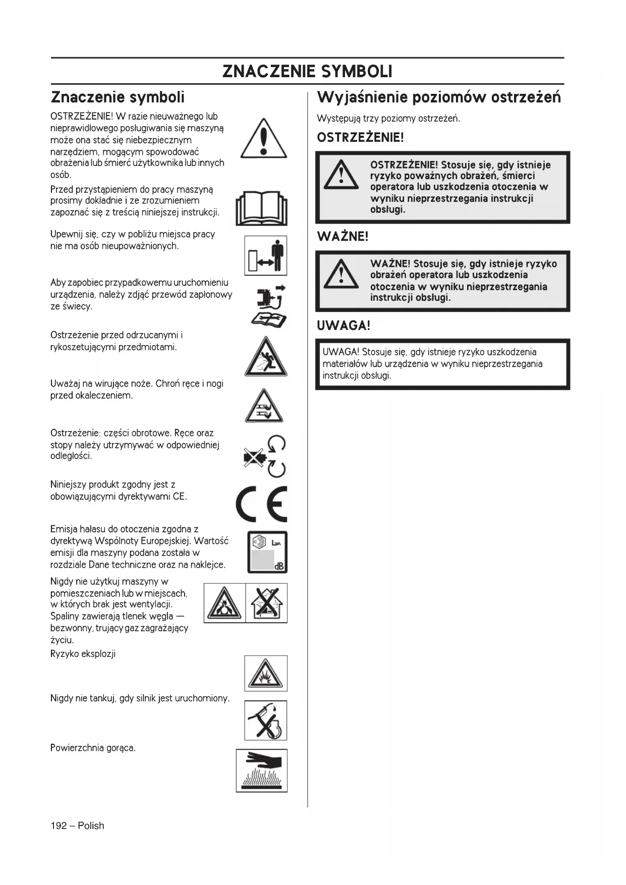 - A 2000/14/EK irányelv módosításáról" szóló 2005/88/EK irányelv (2005. december 14.) A zajértékek a használati utasításban, a mıszaki adatok fejezetben találhatók. Alkalmazott szabványok: ISO5395-1&2:2013; ISO3744, ISO11094; EN1032, EN1033; ISO14982; MegfelelŒség értékelési eljárás, VIII. melléklet 2016. április 20. John Thompson, EUAP termék- és marketingigazgató (A Husqvarna AB technikai dokumentációért felelŒs hivatalos képviselete.)ZNACZENIE SYMBOLI 192 – Polish Znaczenie symboli OSTRZE˚ENIE! W razie nieuwa˝nego lub nieprawid∏owego pos∏ugiwania si´ maszynà mo˝e ona staç si´ niebezpiecznym narz´dziem, mogàcym spowodowaç obra˝enia lub Êmierç u˝ytkownika lub innych osób. Przed przystàpieniem do pracy maszynà prosimy dok∏adnie i ze zrozumieniem zapoznaç si´ z treÊcià niniejszej instrukcji. Upewnij si´, czy w pobli˝u miejsca pracy nie ma osób nieupowa˝nionych. Aby zapobiec przypadkowemu uruchomieniu urzàdzenia, nale˝y zdjàç przewód zap∏onowy ze Êwiecy. Ostrze˝enie przed odrzucanymi i rykoszetujàcymi przedmiotami. Uwa˝aj na wirujàce no˝e. Chroƒ r´ce i nogi przed okaleczeniem. Ostrze˝enie: cz´Êci obrotowe. R´ce oraz stopy nale˝y utrzymywaç w odpowiedniej odleg∏oÊci. Niniejszy produkt zgodny jest z obowiàzujàcymi dyrektywami CE. Emisja ha∏asu do otoczenia zgodna z dyrektywà Wspólnoty Europejskiej. WartoÊç emisji dla maszyny podana zosta∏a w rozdziale Dane techniczne oraz na naklejce. Nigdy nie u˝ytkuj maszyny w pomieszczeniach lub w miejscach, w których brak jest wentylacji. Spaliny zawierajà tlenek w´gla — bezwonny, trujàcy gaz zagra˝ajàcy ˝yciu. Ryzyko eksplozji Nigdy nie tankuj, gdy silnik jest uruchomiony. Powierzchnia goràca. WyjaÊnienie poziomów ostrze˝eƒ Wyst´pujà trzy poziomy ostrze˝eƒ. OSTRZE˚ENIE! WA˚NE! UWAGA!