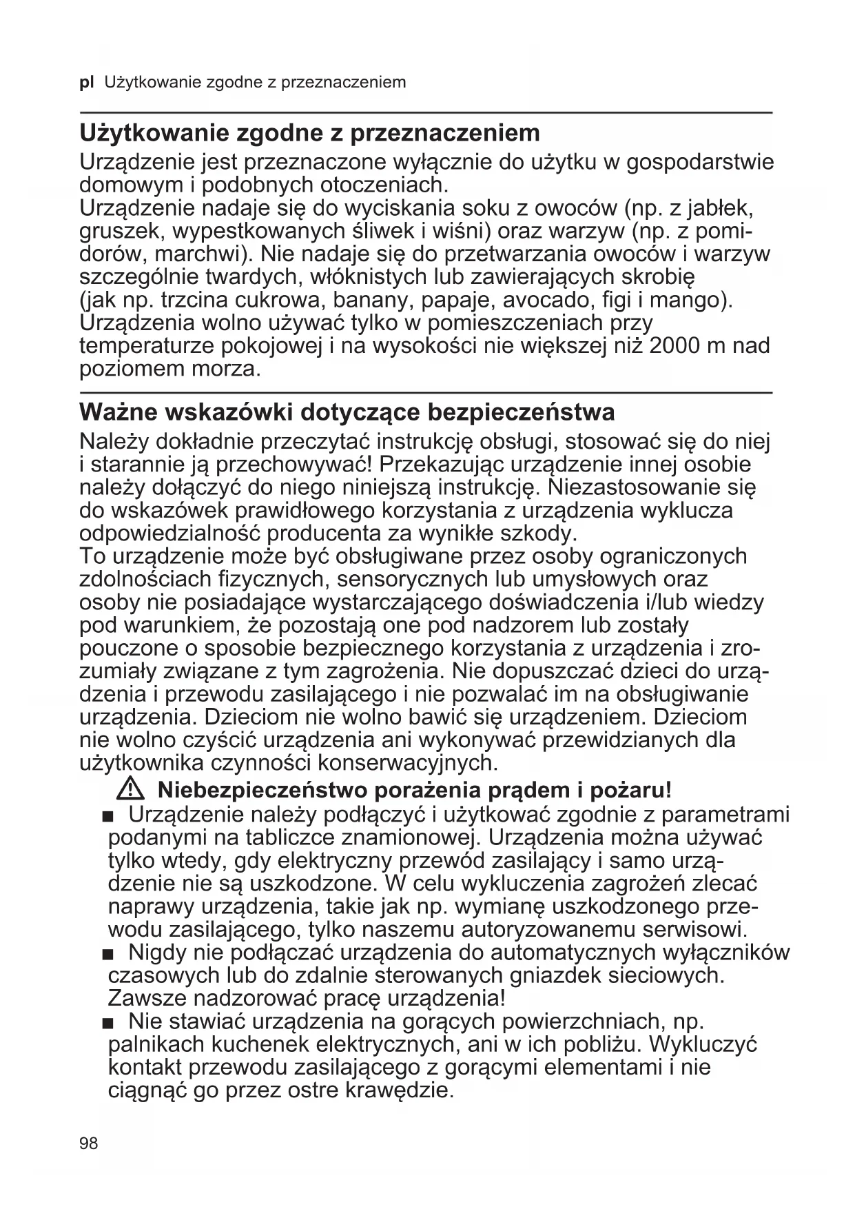 Użytkowanie zgodne z przeznaczeniem .. 98