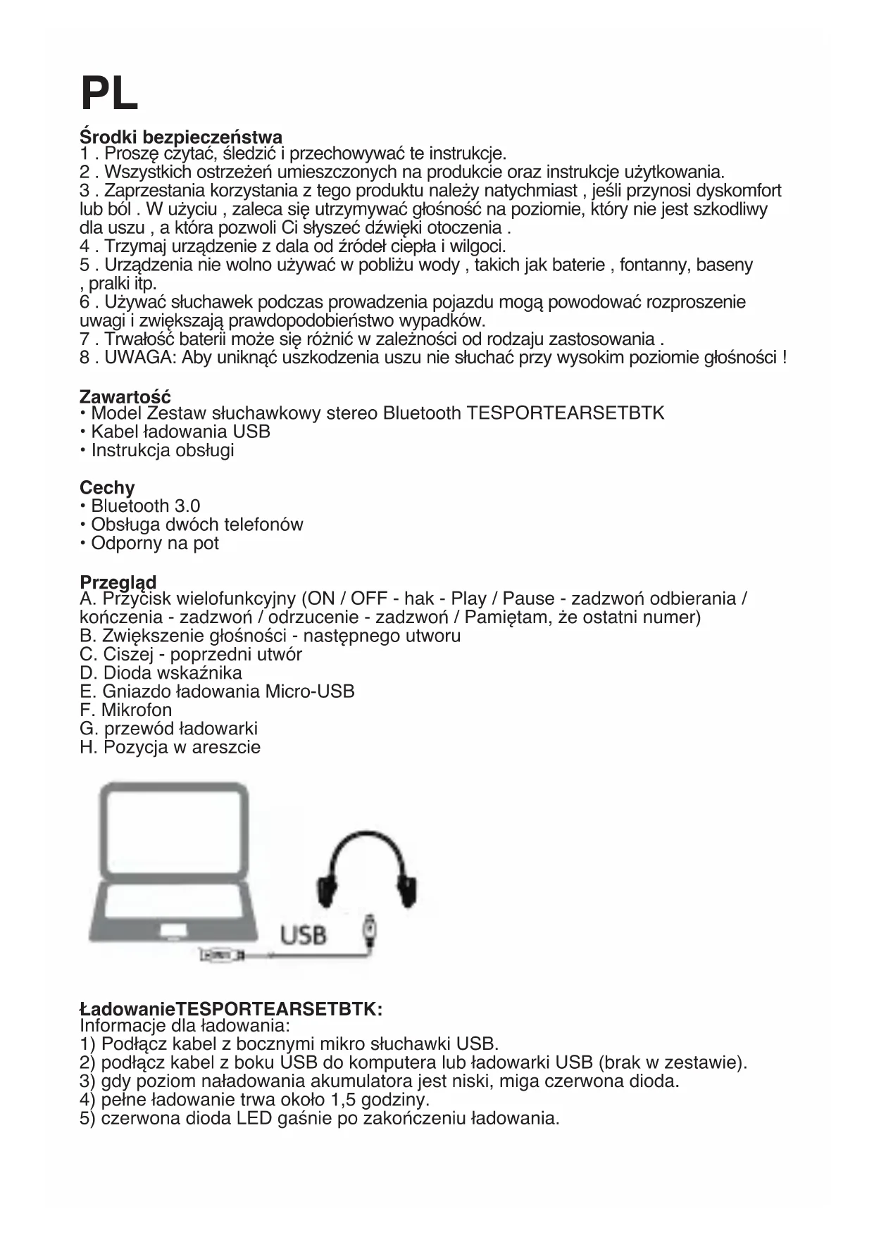 - Odporny na pot Przegląd A. Przycisk wielofunkcyjny (ON / OFF - hak - Play / Pause - zadzwoń odbierania / kończenia - zadzwoń / odrzucenie - zadzwoń / Pamiętam, że ostatni numer) B. Zwiększenie głośności - następnego utworu C. Ciszej - poprzedni utwór D. Dioda wskaźnika E. Gniazdo ładowania Micro-USB F. Mikrofon G. przewód ładowarki H. Pozycja w areszcie Charging the TESPORTEARSETBTK ŁadowanieTESPORTEARSETBTK: Informacje dla ładowania: