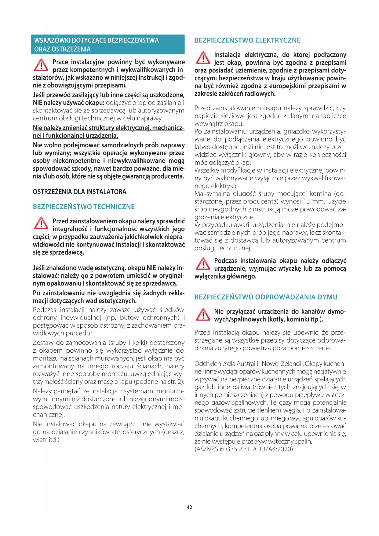 OSTRZEŻENIA DLA INSTALATORA BEZPIECZEŃSTWO TECHNICZNE Przed zainstalowaniem okapu należy sprawdzić