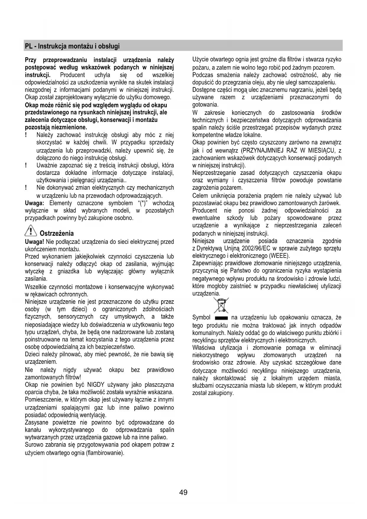 Przy przypegowadzaniu instalacji urzadzenia sązy postepować wedlug wskazówek podanych w niniejszej instrukcji. Producent uchyla sie od wszelkiej odpowiedzialnosci za uszkodzenia winikle na skutek instalacji niedzgodnej z informacjami podanymi w niniejszej instrukcji. Okap zostat zaprojectowy wyłącznie do uzytku domowego.