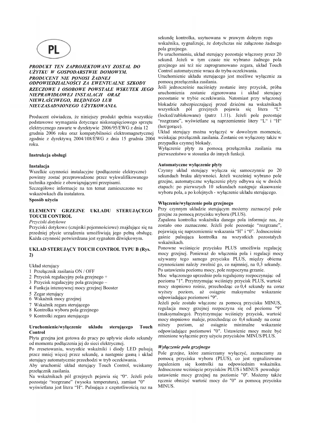 Układ sterujący 1 Przełącznik zasilania ON / OFF 2 Przycisk regulacyjny pola grzejnego + 3 Przycisk regulacyjny pola grzejnego – 4 Funkcja intensywnej mocy grzejnej Booster 5 Zegar sterujący 6 Wskaźnik mocy grzejnej 7 Wskaźnik zegara sterującego 8 Kontrolka wyboru pola grzejnego 9 Kontrolki zegara sterującego Uruchomienie/wyłączenie układu sterującego Touch Control Płyta grzejna jest gotowa do pracy po upływie około sekundy od momentu podłączenia jej do sieci elektrycznej. Po zresetowaniu, wszystkie wskaźniki i diody LED pulsują przez mniej więcej przez sekundę, a następnie gasną i układ sterujący automatycznie przechodzi w tryb oczekiwania. Aby uruchomić układ sterujący Touch Control, wciskamy przełącznik zasilania. Na wskaźnikach pól grzejnych pojawia się “0“. Jeżeli pole pozostaje “rozgrzane” (wysoka temperatura), zamiast "0" wyświetlana jest litera “H“. Pulsująca z częstotliwością raz na sekundę kontrolka, usytuowana w prawym dolnym rogu wskaźnika, sygnalizuje, że dotychczas nie załączono żadnego pola grzejnego. Po uruchomieniu, układ sterujący pozostaje włączony przez 20 sekund. Jeżeli w tym czasie nie wybrano żadnego pola grzejnego ani też nie zaprogramowano zegara, układ Touch Control automatycznie wraca do trybu oczekiwania. Uruchomienie układu sterującego jest możliwe wyłącznie za pomocą przełącznika zasilania. Jeśli jednocześnie naciśnięty zostanie inny przycisk, próba uruchomienia zostanie zignorowana i układ sterujący pozostanie w trybie oczekiwania. Natomiast przy włączonej blokadzie zabezpieczającej przed dziećmi na wskaź nikach wszystkich pól grzejnych pojawia się litera “L“ (locked/zablokowane) (patrz 1.11). Jeżeli pole pozostaje “rozgrzane”, wyświetlane są naprzemiennie litery “L“ i “H“ (hot/gorące). Układ sterujący można wyłączyć w dowolnym momencie, wciskając przełącznik zasilania. Zostanie on wyłączony także w przypadku czynnej blokady. Wyłączenie płyty za pomocą przełącznika zasilania ma pierwszeństwo w stosunku do innych funkcji. Automatyczne wyłączenie płyty Czynny układ sterujący wyłącza się samoczynnie po 20 sekundach braku aktywności. Jeżeli wcześniej wybrano pole grzejne, automatyczne wyłączenie płyty odbywa się w dwóch etapach: po pierwszych 10 sekundach następuje skasowanie wyboru pola, a po kolejnych - wyłączenie układu sterującego. Włączenie/wyłączenie pola grzejnego Przy czynnym układzie sterującym możemy zaznaczyć pole grzejne za pomocą przycisku wyboru (PLUS). Zapalona kontrolka wskaźnika danego pola informuje nas, że zostało ono zaznaczone. Jeżeli pole pozostaje “rozgrzane”, pojawiają się naprzemiennie wskazania “H” i “0”. Jednocześnie gaśnie pulsująca kontrolka na wszystkich pozostałych wskaźnikach. Ponowne wciśnięcie przycisku PLUS umożliwia regulację mocy grzejnej. Ponieważ do włączenia pola i regulacji mocy używamy tego samego przycisku PLUS, między obiema czynnościami należy zwolnić go, co najmniej, na 0,3 sekundy. Po ustawieniu poziomu mocy, pole rozpoczyna grzanie. Moc włączonego uprzednio pola regulujemy rozpoczynając od poziomu "1". Przytrzymując wciśnięty przycisk PLUS, wartość mocy stopniowo rośnie, przechodząc co 0,4 sekundy na coraz wyższy poziom, aż osiągnie maksymalne wskazanie odpowiadające poziomowi "9". Jeżeli pole zostało włączone za pomocą przycisku MINUS, regulacja mocy grzejnej rozpoczyna się od poziomu "9" (maksymalnego). Przytrzymując wciśnięty przycisk, wartość mocy stopniowo maleje, przechodząc co 0,4 sekundy na coraz niższy poziom, aż osiągnie minimalne wskazanie odpowiadające poziomowi "0". Ustawienie mocy może być zmienione wyłącznie przy użyciu przycisków MINUS/PLUS. Wyłączenie pola grzejnego Pole grzejne, które zamierzamy wyłączyć, zaznaczamy za pomocą przycisku wyboru (PLUS), co jest sygnalizowane zapaleniem się kontrolki na odpowiednim wskaźniku. Jednoczesne wciśnięcie przycisków PLUS i MINUS powoduje ustawienie mocy grzejnej na poziomie "0". Możemy także ręcznie obniżyć wartość mocy do "0" za pomocą przycisku MINUS.Ustawienie wszystkich pól grzejnych na poziomie "0" sygnalizowane jest migotaniem odpowiednich kontrolek na wskaźnikach. Jeżeli którekolwiek pole pozostaje “rozgrzane”, zamiast "0" pojawia się litera “H”. Wyłączenie wszystkich pól grzejnych Aby doprowadzić do natychmiastowego wyłączenia wszystkich pól, wystarczy wcisnąć przełącznik zasilania. W trybie oczekiwania, na wskaźnikach "rozgrzanych" pól pojawia się litera “H“. Wskaź niki innych pól pozostają zgaszone. Poziom mocy grzejnej Moc grzejną pola można ustawić na 9 różnych poziomach, oznaczanych na siedmiosegmentowym wskaźniku od “1“ do “9“. Funkcja automatycznego gotowania (przy wybranym poziomie mocy) W czasie działania tej funkcji uwalniane jest 100% mocy użytkowej danego pola grzejnego, a po osiągnięcia stanu wrzenia potrawy, następuje jej zmniejszenie do poziomu wybranego wcześniej przez użytkownika. Czas działania funkcji zależy od wybranego poziomu mocy dalszego gotowania. Rozpoczęcie automatycznego gotowania: - Przy czynnym układzie sterującym zaznaczamy wybrane pole grzejne. - Ustawiamy moc na poziomie "9", a następnie doprowadzamy do włączenia funkcji automatycznego gotowania, wciskając raz jeszcze przycisk PLUS. - Regulujemy poziom mocy dalszego gotowania przy użyciu przycisków PLUS i MINUS - na wskaźniku pojawia wybrana wartość. - W trzy sekundy po ostatnim wciśnięciu przycisku (nastawa poziomu mocy grzejnej) i przed upływem 16 sekund od momentu włączenia funkcji automatycznego gotowania, na wskaźniku pojawiają się naprzemiennie litera “A” (oznaczająca wzrost mocy) i wybrany poziom mocy. - Jeżeli wybrany przez nas za pomocą przycisku MINUS poziom mocy jest zbyt niski, funkcja automatycznego gotowania wyłączy się sa