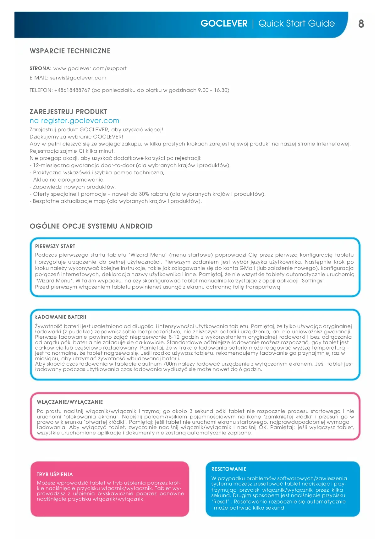 PIERWSZY START Podczas pierwszego startu tabletu ‘Wizard Menu’ (menu startowe) poprowadzi Cię przez pierwszą konfigurację tabletu i przygotuje urządzenie do pełnej użyteczności. Pierwszym zadaniem jest wybór języka użytkownika. Następnie krok po kroku należy wykonywać kolejne instrukcje, takie jak zalogowanie się do konta GMail (lub założenie nowego), konfiguracja połączeń internetowych, deklaracja nazwy użytkownika i inne. Pamiętaj, że nie wszystkie tablety automatycznie uruchomią ‘Wizard Menu’. W takim wypadku, należy skonfigurować tablet manualnie korzystając z opcji aplikacji ‘Settings’. Przed pierwszym włączeniem tabletu powinieneś usunąć z ekranu ochronną folię transportową. ZAREJESTRUJ PRODUKT na register.goclever.com Zarejestruj produkt GOCLEVER, aby uzyskać więcej! Dziękujemy za wybranie GOCLEVER! Aby w pełni cieszyć się ze swojego zakupu, w kilku prostych krokach zarejestruj swój produkt na naszej stronie internetowej. Rejestracja zajmie Ci kilka minut. Nie przegap okazji, aby uzyskać dodatkowe korzyści po rejestracji: - 12-miesięczna gwarancja door-to-door (dla wybranych krajów i produktów), - Praktyczne wskazówki i szybka pomoc techniczna, - Aktualne oprogramowanie, - Zapowiedzi nowych produktów, - Oferty specjalne i promocje – nawet do 30% rabatu (dla wybranych krajów i produktów), - Bezpłatne aktualizacje map (dla wybranych krajów i produktów).
