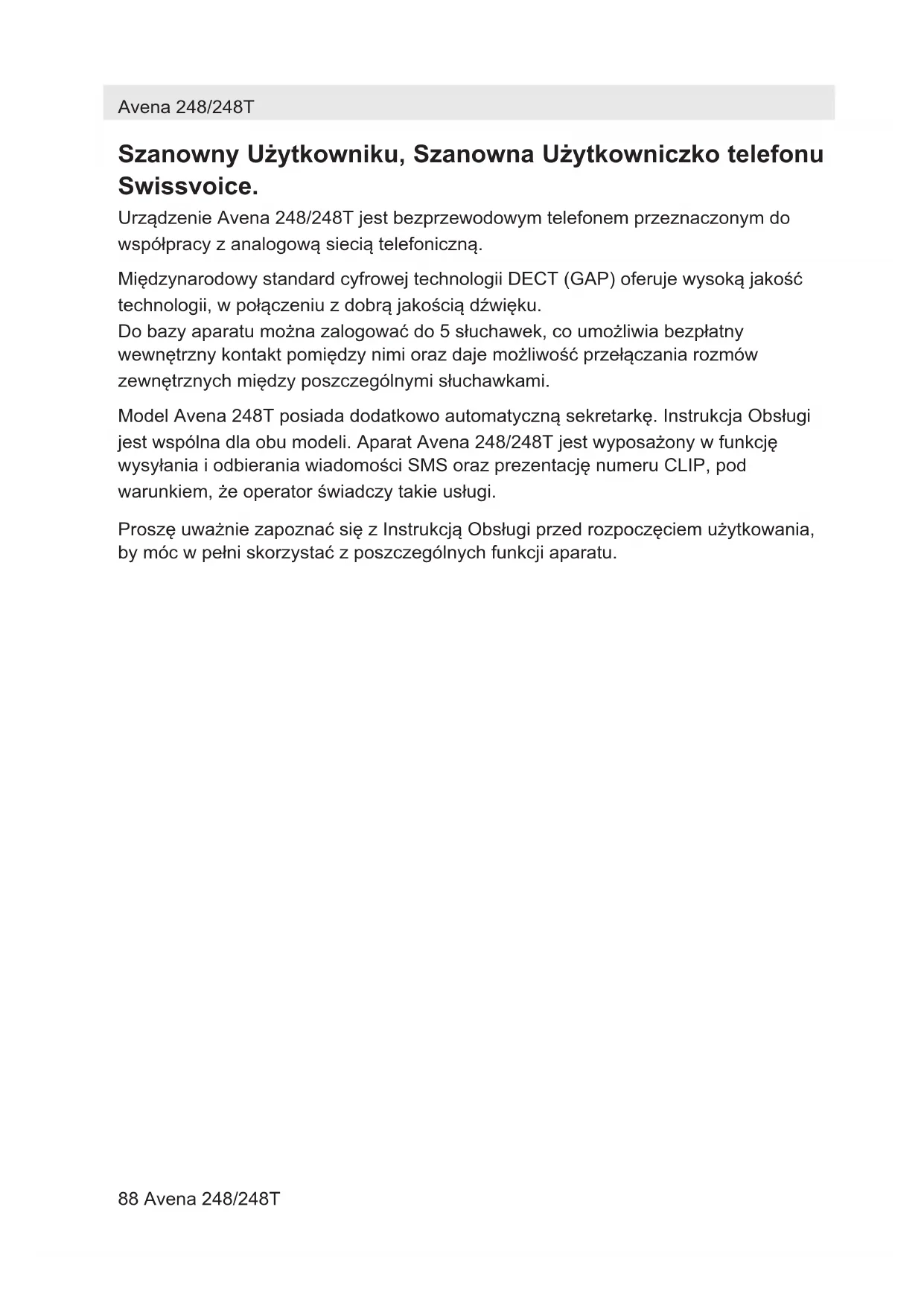 - Adapter stosowany do konwersji telefonii internetowej lub kablowej na analogowy sygnał telefoniczny (zazwyczaj dostarczany przez operatora) może nie przekazywać odpowiednich danych do podłączonego telefonu lub może przekazywać je w niewłaściwym formacie. Jeśli tak się dzieje, proszę sprawdzić aparat w innej lokalizacji, podłączając go do standardowej (analogowej) linii telefonicznej i/lub skontaktować się ze swoim operatorem. Konserwacja Twój telefon jest zaawansowanym produktem o nowoczesnym wyglądzie i konstrukcji, dlatego należy dbać o jego czystość i uważać na niego podczas transportu. Ele- mentów obudowy nie należy czyścić silnymi środkami chemicznymi. Do czyszczenia należy stosować delikatnie nawilżoną antystatyczną szmatkę. Uwaga: Prosimy nie zostawiać aparatu w pomieszczeniach o dużym zawilgoceniu takich jak np.: łazienka (prysznic, wanna), parapet okna (może być wilgotny podczas deszczu, jeśli okno zostanie uchylone). Recykling (utylizacja) Jeśli przestaniesz używać telefonu i zechcesz się go pozbyć, pamiętaj że nie wolno wyrzucać go do tradycyjnego kosza na śmieci. Prosimy o odniesienie go do punktu zbiórki odpadów elektrycznych i elektronicznych w Twojej gminie (dzielnicy), gdzie zostanie przyjęty nieodpłatnie. Symbol widniejący na produkcie, w instrukcji obsługi i/lub na opakowaniu określa sposób jego utylizacji. Wszystkie podzespoły aparatu Avena 248/248T należy utylizować w sposób przyjazny dla środowiska naturalnego. Niektóre elementy, z których wykonany jest aparat, można ponownie wykorzystać w Avena 248/248T 108 Avena 248/248Tprocesie recyklingu, zmniejszając tym samym ilość szkodliwych odpadów. Więcej informacji na ten temat dostępnych jest w Internecie pod hasłem recykling. Postępowanie ze zużytymi akumulatorami Zgodnie z prawem również zużyte akumulatorki należy wyrzucać do odpowiednio oznakowanych pojemników (nie wolno wyrzucać ich do zwykłego kosza na śmieci). Każdy z akumulatorów ma odpowiedni symbol na etykiecie. Przypominamy, że w apa- racie Avena 248/248T można stosować wyłącznie akumulatory typu Nikiel- Wodorek (Ni-MH). Potwierdzenie zgodności / certyfikat CE Telefon analogowy DECT Avena 248/248T spełnia podstawowe wymogi Unii Europejskiej (dyrektywa 1999/5/UE Parlamentu Europejskiego i Rady Europejskiej dotycząca sprzętu radiowego, wyposażenia telekomunikacyjnego, oraz rozpoznawania ich zgodności) i można go przyłączać, oraz użytkować w państwach członkowskich Unii Europejskiej, wskazanych na etykiecie bazy i/lub na opakowaniu. Potwierdzenie deklaracji zgodności można zobaczyć na: www.swissvoice.net. Spełnianie powyższych wymagań potwierdzone jest przez znak CE. Warunki gwarancji Szanowny Kliencie, Dziękujemy za zakup naszego produktu. Urządzenia firmy Swissvoice są zapro- jektowane i wyprodukowane według najnowszych technologii, reprezentują europejskie standardy jakości i niezawodności oraz oferują najwyższą funkcjonalność i niepowtarzalną stylistykę. Przed rozpoczęciem korzystania ze sprzętu należy zapoznać się z procedurami instalacji oraz warunkami eksploatacyjnymi urządzenia szczegółowo opisanymi w jego Instrukcji Obsługi. W przypadku jakichkolwiek pro- blemów prosimy o zwrócenie się do Autoryzowanego Serwisu firmy Swissvoice pod numerem telefonu 801 800 308. Nasi konsultanci służą Państwu pomocą w zakresie porad technicznych i eksploatacyjnych oraz realizacji uprawnień gwarancyjnych. Avena 248/248T Avena 248/248T 109Warunki gwarancji Swissvoice S.A. zwana dalej jako „Swissvoice” udziela niniejszym kupującemu gwarancji na urządzenie, opisane szczegółowo w fakturze oraz Karcie Gwarancyjnej, co do jego dobrej jakości i wykonania. Okres gwarancji wynosi 24 miesiące począwszy od daty odbioru urządzenia, potwierdzonej podpisem i pieczęcią sprzedawcy, zaś gwarancja zostaje udzielona zgodnie z wymienionymi niżej warunkami. Do uznania roszczenia gwarancyjnego w imieniu Swissvoice w Polsce uprawniony jest wyłącznie Autoryzowany Serwis Swissvoice zwany dalej „Autoryzowanym Serwisem”. § 1 Zakres gwarancji