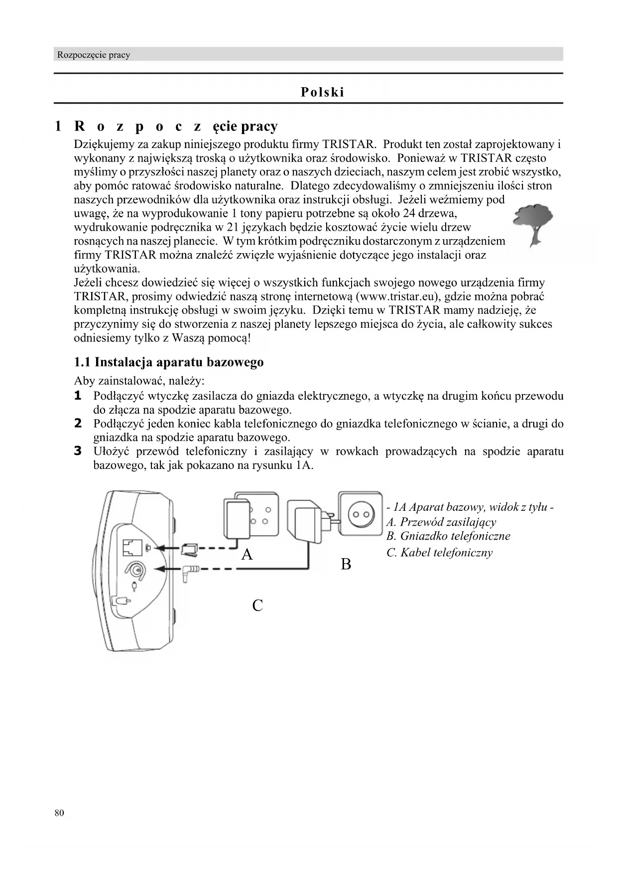 1 Πατήστε το αριστερό πλήκτρο μενού για να εισέλθετε στο μενού. 2 Επιλέξτε “HS SETTINGS” και επιβεβαιώστε. 3 Επιλέξτε “AUTO ANSWER” και επιβεβαιώστε. 4 Επιλέξτε “ON” για να την ενεργοποιήσετε ή “OFF” για να την απενεργοποιήσετε και κατόπιν επιβεβαιώστε. 1 Πατήστε και κρατήστε πατημένο το πλήκτρο κλειδώματος πληκτρολογίου για 3 δευτερόλεπτα. Τότε, το πληκτρολόγιο θα κλειδωθεί. Τότε, στην οθόνη θα εμφανιστεί η ένδειξη “”. 1 Πατήστε και κρατήστε πατημένο το πλήκτρο κλειδώματος πληκτρολογίου για 3 δευτερόλεπτα. 2 Τότε η ένδειξη “” θα εξαφανιστεί από την οθόνη.80 Rozpoczęcie pracy Polski 1Rozpoczęcie pracy Dziękujemy za zakup niniejszego produktu firmy TRISTAR. Produkt ten został zaprojektowany i wykonany z największą troską o użytkownika oraz środowisko. Ponieważ w TRISTAR często myślimy o przyszłości naszej planety oraz o naszych dzieciach, naszym celem jest zrobić wszystko, aby pomóc ratować środowisko naturalne. Dlatego zdecydowaliśmy o zmniejszeniu ilości stron naszych przewodników dla użytkownika oraz instrukcji obsługi. Jeżeli weźmiemy pod uwagę, że na wyprodukowanie 1 tony papieru potrzebne są około 24 drzewa, wydrukowanie podręcznika w 21 językach będzie kosztować życie wielu drzew rosnących na naszej planecie. W tym krótkim podręczniku dostarczonym z urządzeniem firmy TRISTAR można znaleźć zwięzłe wyjaśnienie dotyczące jego instalacji oraz użytkowania. Jeżeli chcesz dowiedzieć się więcej o wszystkich funkcjach swojego nowego urządzenia firmy TRISTAR, prosimy odwiedzić naszą stronę internetową (www.tristar.eu), gdzie można pobrać kompletną instrukcję obsługi w swoim języku. Dzięki temu w TRISTAR mamy nadzieję, że przyczynimy się do stworzenia z naszej planety lepszego miejsca do życia, ale całkowity sukces odniesiemy tylko z Waszą pomocą!