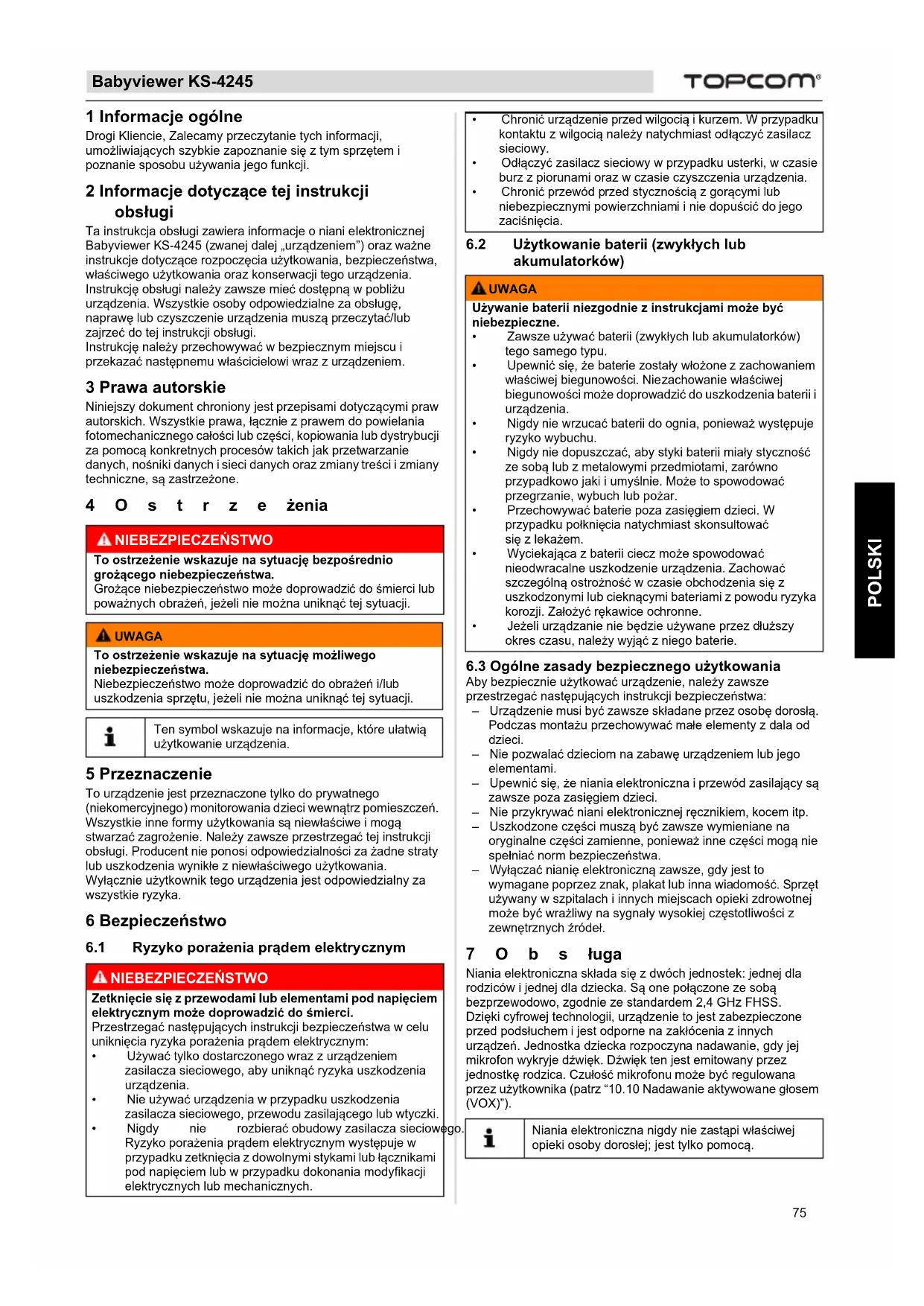 POLSKI 1 Informacje ogólne Drogi Kliencie, Zalecamy przeczytanie tych informacji, umożliwiających szybkie zapoznanie się z tym sprzętem i poznanie sposobu używania jego funkcji. 2 Informacje dotyczące tej instrukcji obsługi Ta instrukcja obsługi zawiera informacje o niani elektronicznej Babyviewer KS-4245 (zwanej dalej „urządzeniem”) oraz ważne instrukcje dotyczące rozpoczęcia użytkowania, bezpieczeństwa, właściwego użytkowania oraz konserwacji tego urządzenia. Instrukcję obsługi należy zawsze mieć dostępną w pobliżu urządzenia. Wszystkie osoby odpowiedzialne za obsługę, naprawę lub czyszczenie urządzenia muszą przeczytać/lub zajrzeć do tej instrukcji obsługi. Instrukcję należy przechowywać w bezpiecznym miejscu i przekazać następnemu właścicielowi wraz z urządzeniem. 3 Prawa autorskie Niniejszy dokument chroniony jest przepisami dotyczącymi praw autorskich. Wszystkie prawa, łącznie z prawem do powielania fotomechanicznego całości lub części, kopiowania lub dystrybucji za pomocą konkretnych procesów takich jak przetwarzanie danych, nośniki danych i sieci danych oraz zmiany treści i zmiany techniczne, są zastrzeżone. 4Ostrzeżenia 5 Przeznaczenie To urządzenie jest przeznaczone tylko do prywatnego (niekomercyjnego) monitorowania dzieci wewnątrz pomieszczeń. Wszystkie inne formy użytkowania są niewłaściwe i mogą stwarzać zagrożenie. Należy zawsze przestrzegać tej instrukcji obsługi. Producent nie ponosi odpowiedzialności za żadne straty lub uszkodzenia wynikłe z niewłaściwego użytkowania. Wyłącznie użytkownik tego urządzenia jest odpowiedzialny za wszystkie ryzyka. 6 Bezpieczeństwo