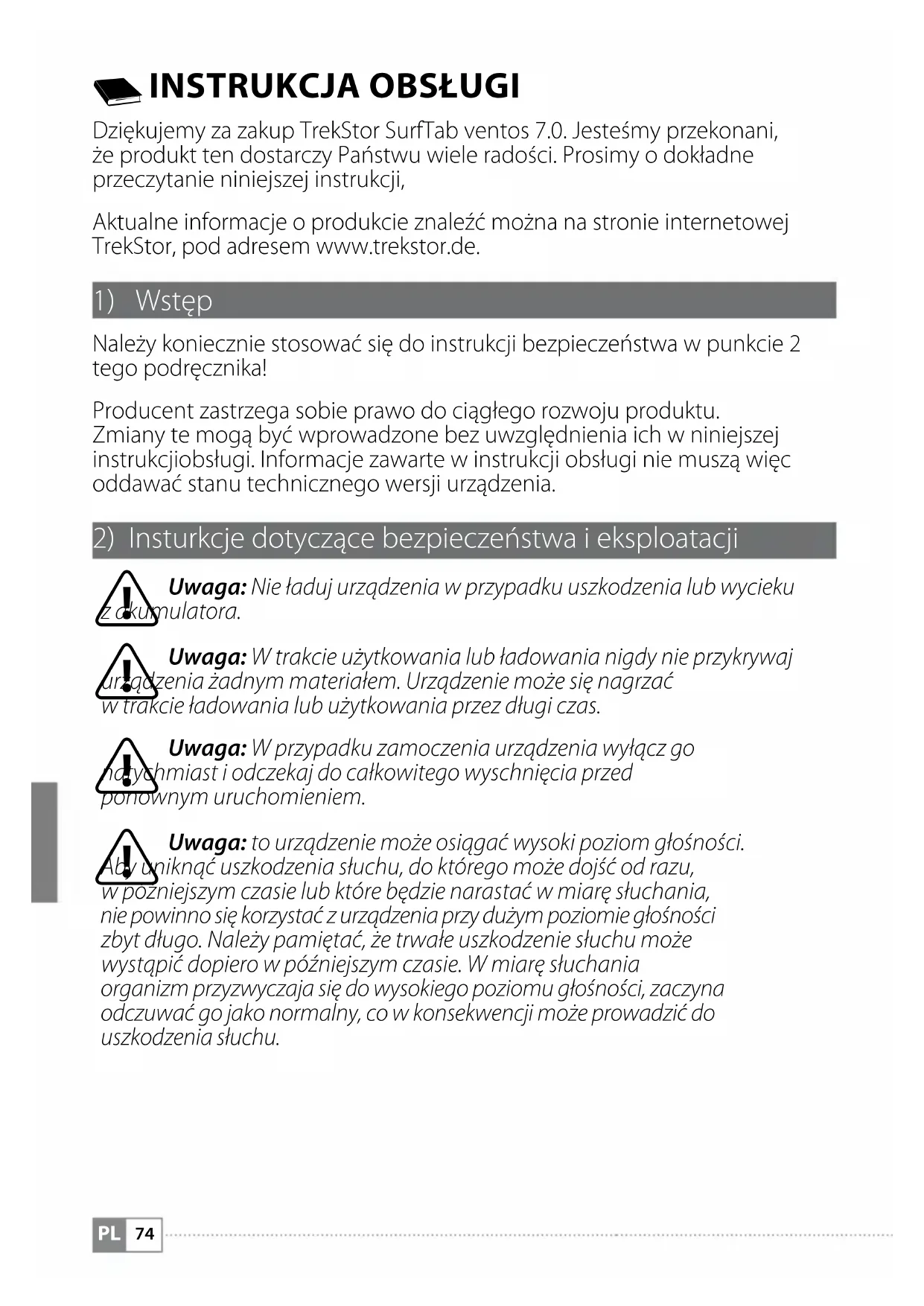 Dziękujemy za zakup TrekStor SurfTab ventos 7.0. Jesteśmy przekonani, że produkt ten dostarczy Państwu wiele radości. Prosimy o dokładne przeczytanie niniejszej instrukcji, Aktualne informacje o produkcie znaleźć można na stronie internetowej TrekStor, pod adresem www.trekstor.de.