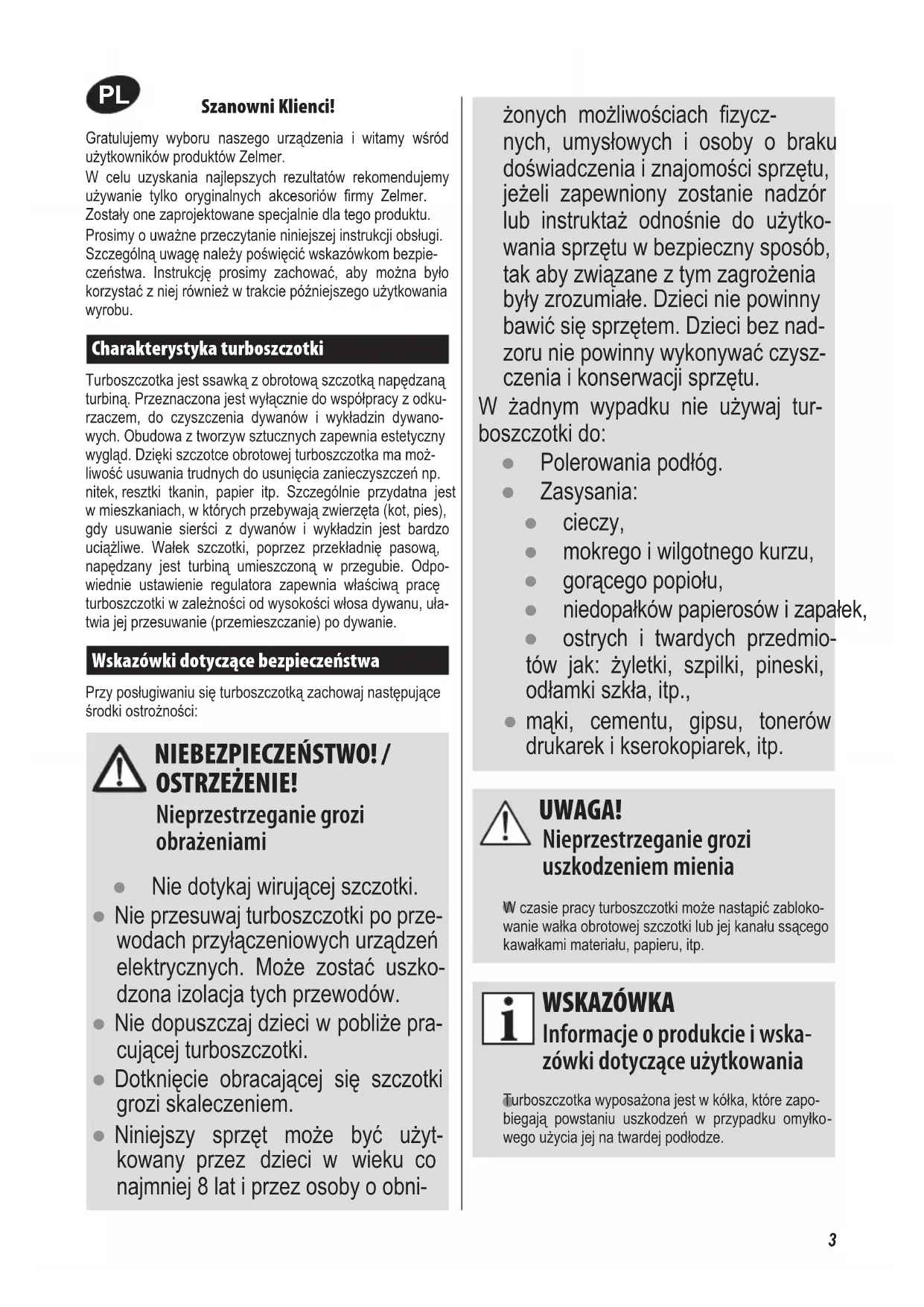 Szanowni Klienci! Gratulujemy wyboru naszego urządzenia i witamy wśród użytkowników produktów Zelmer. W celu uzyskania najlepszych rezultatów rekomendujemy używanie tylko oryginalnych akcesoriów rmy Zelmer. Zostały one zaprojektowane specjalnie dla tego produktu.Prosimy o uważne przeczytanie niniejszej instrukcji obsługi. Szczególną uwagę należy poświęcić wskazówkom bezpie- czeństwa. Instrukcję prosimy zachować, aby można było korzystać z niej również w trakcie późniejszego użytkowania wyrobu. Charakterystyka turboszczotkiTurboszczotka jest ssawką z obrotową szczotką napędzaną turbiną. Przeznaczona jest wyłącznie do współpracy z odku-rzaczem, do czyszczenia dywanów i wykładzin dywano-wych. Obudowa z tworzyw sztucznych zapewnia estetyczny wygląd. Dzięki szczotce obrotowej turboszczotka ma moż-liwość usuwania trudnych do usunięcia zanieczyszczeń np. nitek, resztki tkanin, papier itp. Szczególnie przydatna jest w mieszkaniach, w których przebywają zwierzęta (kot, pies), gdy usuwanie sierści z dywanów i wykładzin jest bardzo uciążliwe. Wałek szczotki, poprzez przekładnię pasową, napędzany jest turbiną umieszczoną w przegubie. Odpo- wiednie ustawienie regulatora zapewnia właściwą pracę turboszczotki w zależności od wysokości włosa dywanu, uła-twia jej przesuwanie (przemieszczanie) po dywanie. Wskazówki dotyczące bezpieczeństwaPrzy posługiwaniu się turboszczotką zachowaj następujące środki ostrożności: żonych możliwościach zycz- nych, umysłowych i osoby o braku doświadczenia i znajomości sprzętu, jeżeli zapewniony zostanie nadzór lub instruktaż odnośnie do użytko- wania sprzętu w bezpieczny sposób, tak aby związane z tym zagrożenia były zrozumiałe. Dzieci nie powinny bawić się sprzętem. Dzieci bez nad- zoru nie powinny wykonywać czysz- czenia i konserwacji sprzętu. W żadnym wypadku nie używaj tur- boszczotki do: ● Polerowania podłóg. ● Zasysania: ● cieczy, ● mokrego i wilgotnego kurzu, ● gorącego popiołu, ● niedopałków papierosów i zapałek, ● ostrych i twardych przedmio- tów jak: żyletki, szpilki, pineski, odłamki szkła, itp., ● mąki, cementu, gipsu, tonerów drukarek i kserokopiarek, itp. NIEBEZPIECZEŃSTWO! / OSTRZEŻENIE! Nieprzestrzeganie grozi obrażeniami ● Nie dotykaj wirującej szczotki. ● Nie przesuwaj turboszczotki po prze- wodach przyłączeniowych urządzeń elektrycznych. Może zostać uszko- dzona izolacja tych przewodów. ● Nie dopuszczaj dzieci w pobliże pra- cującej turboszczotki. ● Dotknięcie obracającej się szczotki grozi skaleczeniem. ● Niniejszy sprzęt może być użyt- kowany przez dzieci w wieku co najmniej 8 lat i przez osoby o obni- UWAGA! Nieprzestrzeganie grozi uszkodzeniem mienia