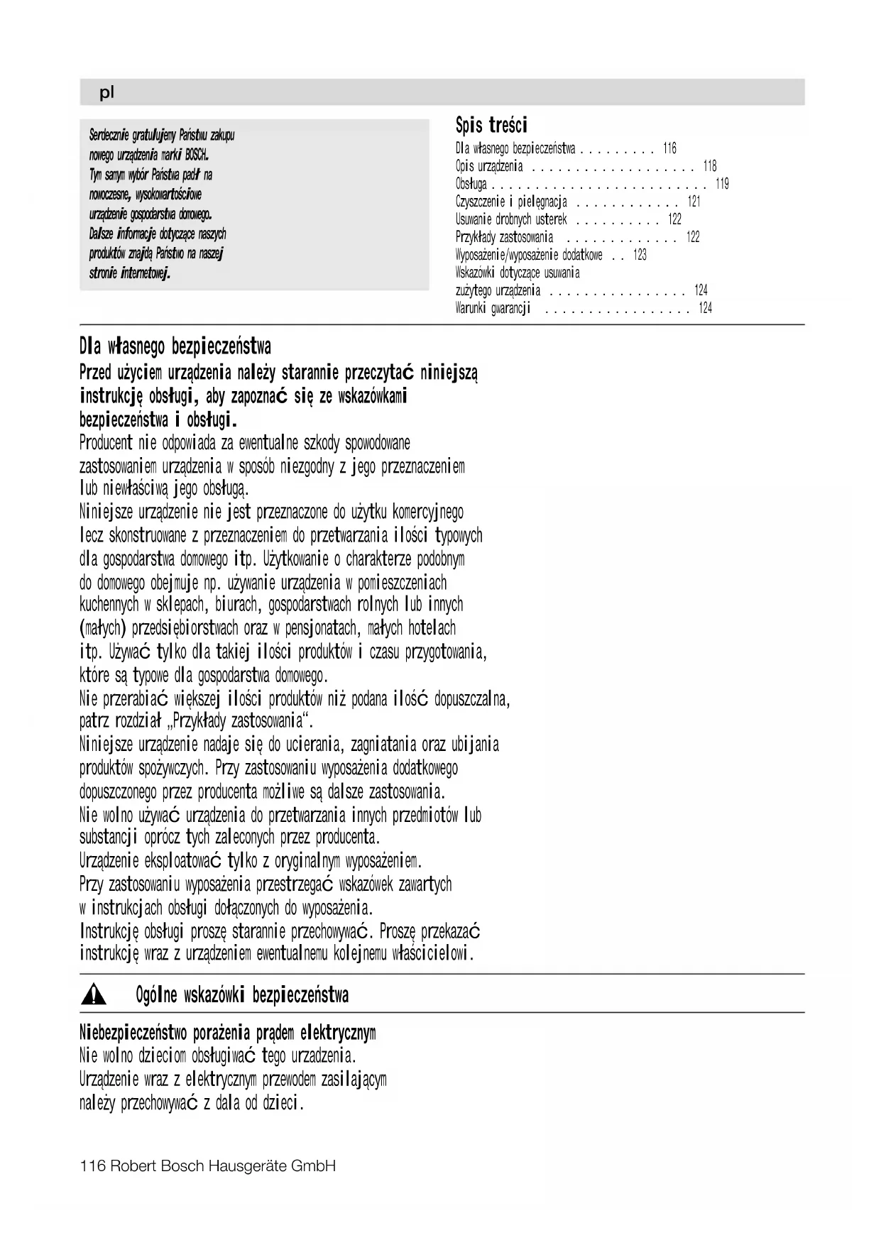 Serdecznie gratulujemy Pañstwu zakupu nowego urz¹dzenia marki BOSCH. Tym samym wybór Pañstwa padł na nowoczesne, wysokowartoœciowe urz¹dzenie gospodarstwa domowego. Dalsze informacje dotycz¹ce naszych produktów znajd¹ Pañstwo na naszej stronie internetowej.Robert Bosch Hausgeräte GmbH 117 Urz¹dzenia mog¹ być obsługiwane przez osoby o ograniczonych zdolnoœciach fizycznych, czuciowych lub umysłowych albo nie posiadaj¹cych odpowiedniego doœwiadczenia/wiedzy tylko pod kontrol¹ osoby odpowiadaj¹cej za bezpieczeñstwo osoby obsługuj¹cej urz¹dzenie lub po dokładnym przeszkoleniu w obsłudze urz¹dzenia oraz po zrozumieniu zagro¿eñ wynikaj¹cych z obsługi urz¹dzenia. Nie pozwalać dzieciom na zabawê urz¹dzeniem. Urz¹dzenie nale¿y podł¹czyć i u¿ytkować zgodnie z parametrami podanymi na tabliczce znamionowej. Urz¹dzenie mo¿na u¿ywać tylko wtedy, gdy elektryczny przewód zasilaj¹cy i samo urz¹dzenie nie s¹ uszkodzone. Zawsze wył¹czać urz¹dzenie gdy jest bez nadzoru, przed monta¿em i demonta¿em oraz przed czyszczeniem. Nie wolno ocierać elektrycznego przewodu zasilaj¹cego o ostre krawêdzie ani gor¹ce powierzchnie. Aby unikn¹ć zagro¿eñ w przypadku uszkodzenia przewodu zasilaj¹cego nale¿y zlecić jego wymianê wył¹cznie producentowi albo jego autoryzowanemu serwisowi lub osobie o podobnych kwalifikacjach i odpowiednich uprawnieniach. Naprawy urz¹dzenia mo¿e przeprowadzić tylko nasz autoryzowany punkt serwisowy. , Wskazówki bezpieczeñstwa dla pracy z niniejszym urz¹dzeniem Niebezpieczeñstwo skaleczenia Niebezpieczeñstwo pora¿enia pr¹dem elektrycznym Wło¿yć wtyczkê do gniazdka sieciowego dopiero wtedy, gdy wszystkie przygotowania do pracy z urz¹dzeniem zostały przeprowadzone. Korpusu urz¹dzenia nigdy nie zanurzać w wodzie ani nie myć pod bie¿¹c¹ wod¹. Nie wolno stosować urz¹dzeñ czyszcz¹cych strumieniem pary. Nie zmieniać poło¿enia ramienia urz¹dzenia, je¿eli urz¹dzenie jest wł¹czone. Zaczekać a¿ napêd całkowicie siê zatrzyma. Narzêdzia/wyposa¿enie mo¿na zmieniać tylko wtedy, je¿eli napêd jest całkowicie nieruchomy – po wył¹czeniu urz¹dzenia napêd pracuje jeszcze przez krótki czas. Urz¹dzenie wł¹czać i wył¹czać tylko przeł¹cznikiem obrotowym. Proszê wyj¹ć wtyczkê z gniazdka sieciowego, je¿eli urz¹dzenie nie jest u¿ywane. Przed przyst¹pieniem do usuwania usterek nale¿y wyj¹ć wtyczkê z gniazdka sieciowego. W przypadku przerwania dopływu pr¹du, urz¹dzenie zacznie pracować natychmiast po wznowieniu dopływu pr¹du. pl118 Robert Bosch Hausgeräte GmbH Niebezpieczeñstwo skaleczenia obracaj¹cymi siê narzêdziami! Nigdy nie dotykać wiruj¹cych elementów urz¹dzenia. Podczas pracy urz¹dzenia nie wolno wkładać r¹k do miski. Wyposa¿enie i narzêdzia zmieniać tylko po wył¹czeniu urz¹dzenia i po zatrzymaniu siê napêdu – po wył¹czeniu urz¹dzenia napêd pracuje jeszcze przez krótk¹ chwilê. Ze wzglêdów bezpieczeñstwa mo¿na wł¹czać urz¹dzenie tylko wtedy, gdy nieu¿ywane napêdy zasłoniête s¹ pokrywami ochronnymi (4, 7). Niebezpieczeñstwo skaleczenia ostrymi no¿ami/obracaj¹cym siê napêdem! Nigdy nie wkładać r¹k do zało¿onego miksera! Miksera nie wolno składać na korpusie urz¹dzenia. Mikser zakładać/ zdejmować tylko wtedy, gdy urz¹dzenie jest wył¹czone a napêd nieruchomy! Mikser mo¿na wł¹czać tylko kompletnie zmontowany i z zało¿on¹ pokryw¹. No¿y miksera nie nale¿y chwytać gołymi rêkoma. Niebezpieczeñstwo poparzenia! Podczas przetwarzania gor¹cych produktów przez lejek w pokrywie wydostaje siê para. Napełniać maksymalnie 0,5 litra gor¹cych lub pieni¹cych siê płynów. Wa¿ne! U¿ywać tylko jedno narzêdzie lub wyposa¿enie. Niniejsza instrukcja obsługi opisuje ró¿ne modele. Na stronach z rysunkami zamieszczony jest przegl¹d ró¿nych modeli (Rysunek
