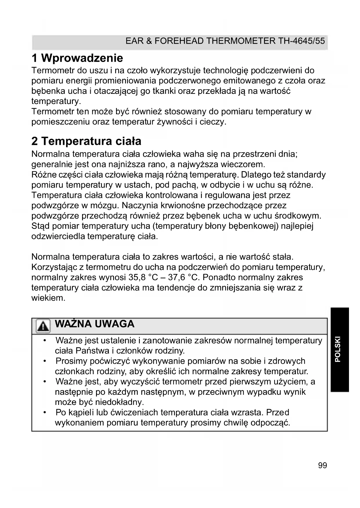 - Po kąpieli lub ćwiczeniach temperatura ciała wzrasta. Przed wykonaniem pomiaru temperatury prosimy chwilę odpocząć. HL_Ear & Forehead Thermometer 301 D106.book Page 99 Thursday, January 17, 2013 10:49 AM100
