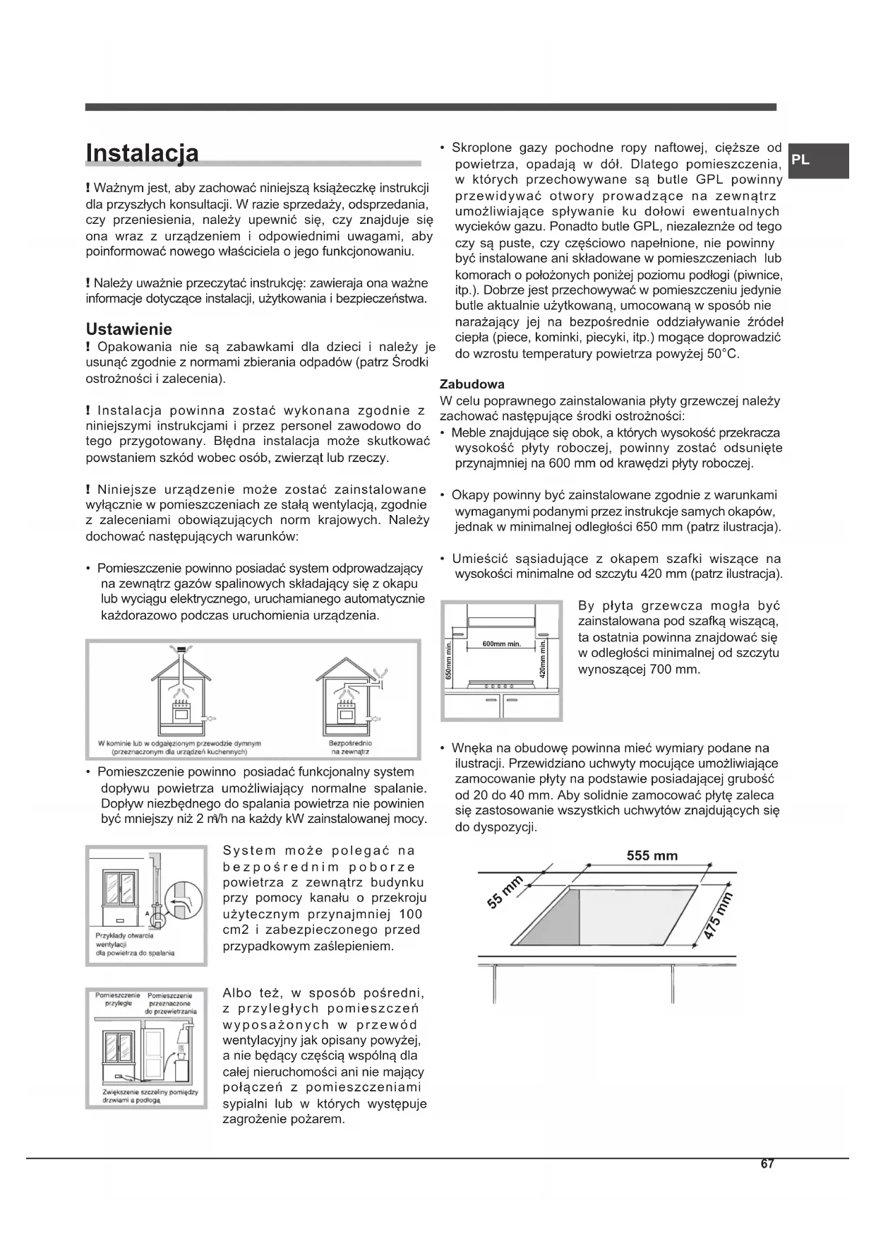 - Urządzenia gazowe wymagają, dla swego poprawnego działania, regularnej wymiany powietrza. należy upewnić się, czy podczas ich instalowania przestrzegane były wymagania zawartye w odpowiednim paragrae dotyczącym “Ustawienia”.