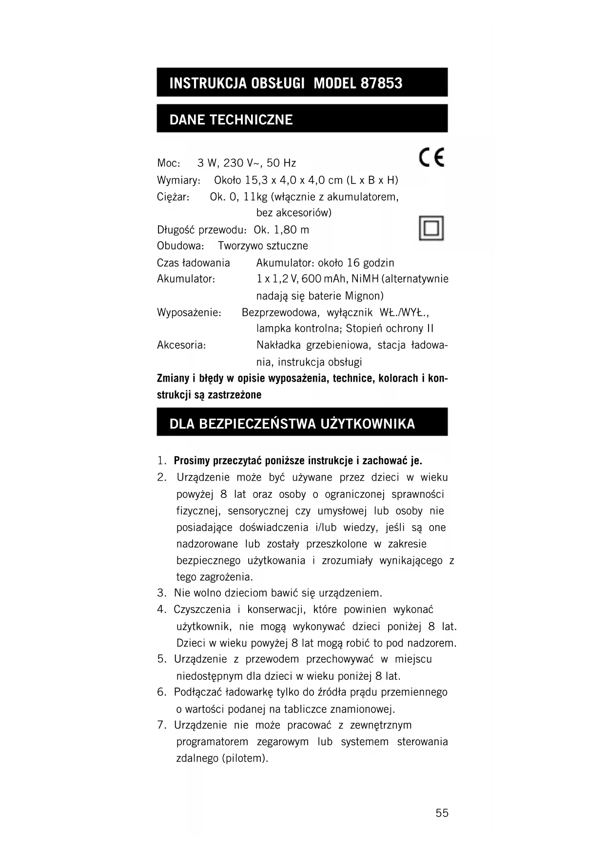 lampka kontrolna; Stopień ochrony II Akcesoria: Nakładka grzebieniowa, stacja ładowa-