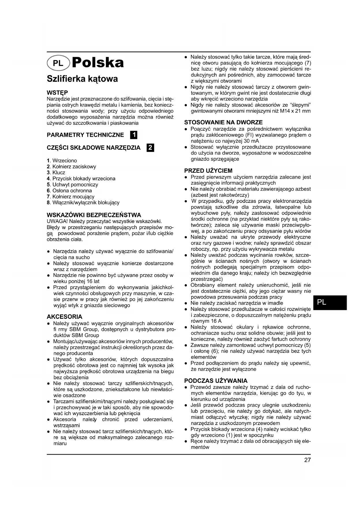 WSKAZÓWKI BEZPIECZEŃSTWAUWAGA! Należy przeczytać wszystkie wskazówki. Błędy w przestrzeganiu następujących przepisów mo- gą powodować porażenie prądem, pożar i/lub ciężkie obrażenia ciała. ● Narzędzia należy używać wyącznie do szlifowania/ cięcia na sucho ● Należy stosować wyącznie konierze dostarczone wraz z narzędziem ● Narzędzie nie powinno być używane przez osoby w wieku poniżej 16 lat● Przed przystąpieniem do wykonywania jakichkol- wiek czynności obsługowych przy maszynie, w cza- sie przerw w pracy jak również po jej zakończeniu wyjąć wtyk z gniazda sieciowegoAKCESORIA ● Należy używać wyącznie oryginalnych akcesoriów fi rmy SBM Group, dostępnych u dystrybutora pro-duktów SBM Group ● Montując/używając akcesoriów innych producentów, należy przestrzegać instrukcji określonych przez da- nego producenta ● Używać tylko akcesoriów, których dopuszczalna prędkość obrotowa jest co najmniej tak wysoka jak najwyższa prędkość obrotowa urządzenia na biegu bez obciążenia ● Nie należy stosować tarczy szlifi erskich/tnących, które są uszkodzone, zniekształcone lub niewłaści- wie osadzone ● Tarczami szlifi erskimi/tnącymi należy posługiwać się i przechowywać je w taki sposób, aby nie spowodo-wać ich wyszczerbienia lub pęknięcia● Akcesoria należy chronić przed uderzeniami, wstrząsami ● Nie należy stosować tarcz szlifi erskich/tnących, któ- re są większe od maksymalnego zalecanego roz- miaru ● Należy stosować tylko takie tarcze, które mają śred- nicę otworu pasującą do kołnierza mocującego (7) bez luzu; nigdy nie należy stosować pierścieni re- dukcyjnych ani pośrednich, aby zamocować tarcze z większymi otworami ● Nigdy nie należy stosować tarczy z otworem gwin- towanym, w którym gwint nie jest dostatecznie długi aby wkręcić wrzeciono narzędzia ● Nigdy nie należy stosować akcesoriów ze “ślepymi” gwintowanymi otworami mniejszymi niż M14 x 21 mmSTOSOWANIE NA DWORZE ● Poączyć narzędzie za pośrednictwem wyłącznika prądu zakłóceniowego (FI) wyzwalanego prądem o natężeniu co najwyżej 30 mA ● Stosować wyłącznie przedłużacze przystosowane do użycia na dworze, wyposażone w wodoszczelne gniazdo sprzęgającePRZED UŻYCIEM ● Przed pierwszym użyciem narzędzia zalecane jest zasięgnięcie informacji praktycznych ● Nie należy obrabiać materiału zawierającego azbest (azbest jest rakotwórczy)● W przypadku, gdy podczas pracy elektronarzędzia powstają szkodliwe dla zdrowia, łatwopalne lub wybuchowe pyły, należy zastosować odpowiednie środki ochronne (na przykład niektóre pyły są rako- twórcze); zaleca się używanie maski przeciwpyło- wej, a po zakończeniu pracy odsysanie pyłu wiórów ● Należy uważać na ukryte przewody elektryczne oraz rury gazowe i wodne; należy sprawdzić obszar roboczy, np. przy użyciu wykrywacza metalu ● Należy uważać podczas wycinania rowków, szcze- gólnie w ścianach nośnych (otwory w ścianach nośnych podlegają specjalnym przepisom odpo- wiednim dla danego kraju; należy ich bezwzględnie przestrzegać