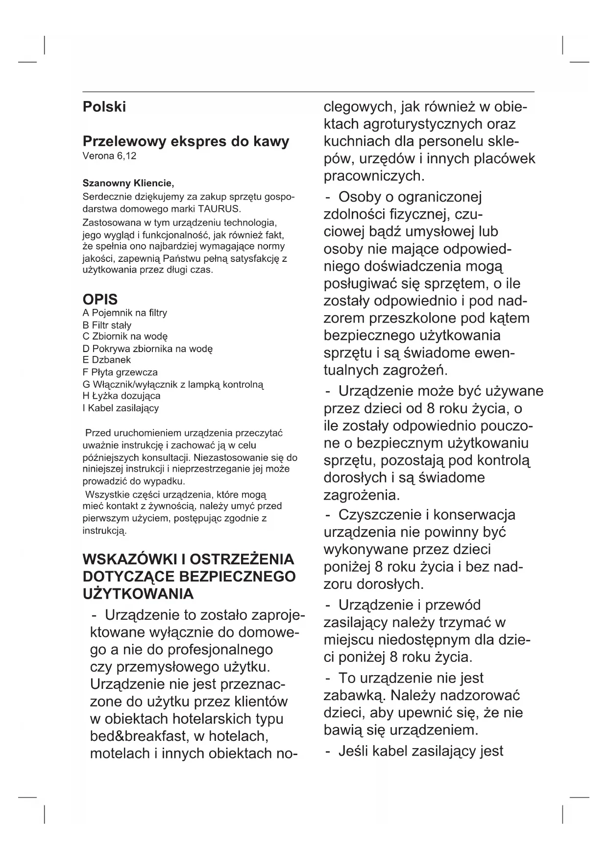 Verona 12 - Ekspres do kawy TAURUS - Bezpłatna instrukcja obsługi