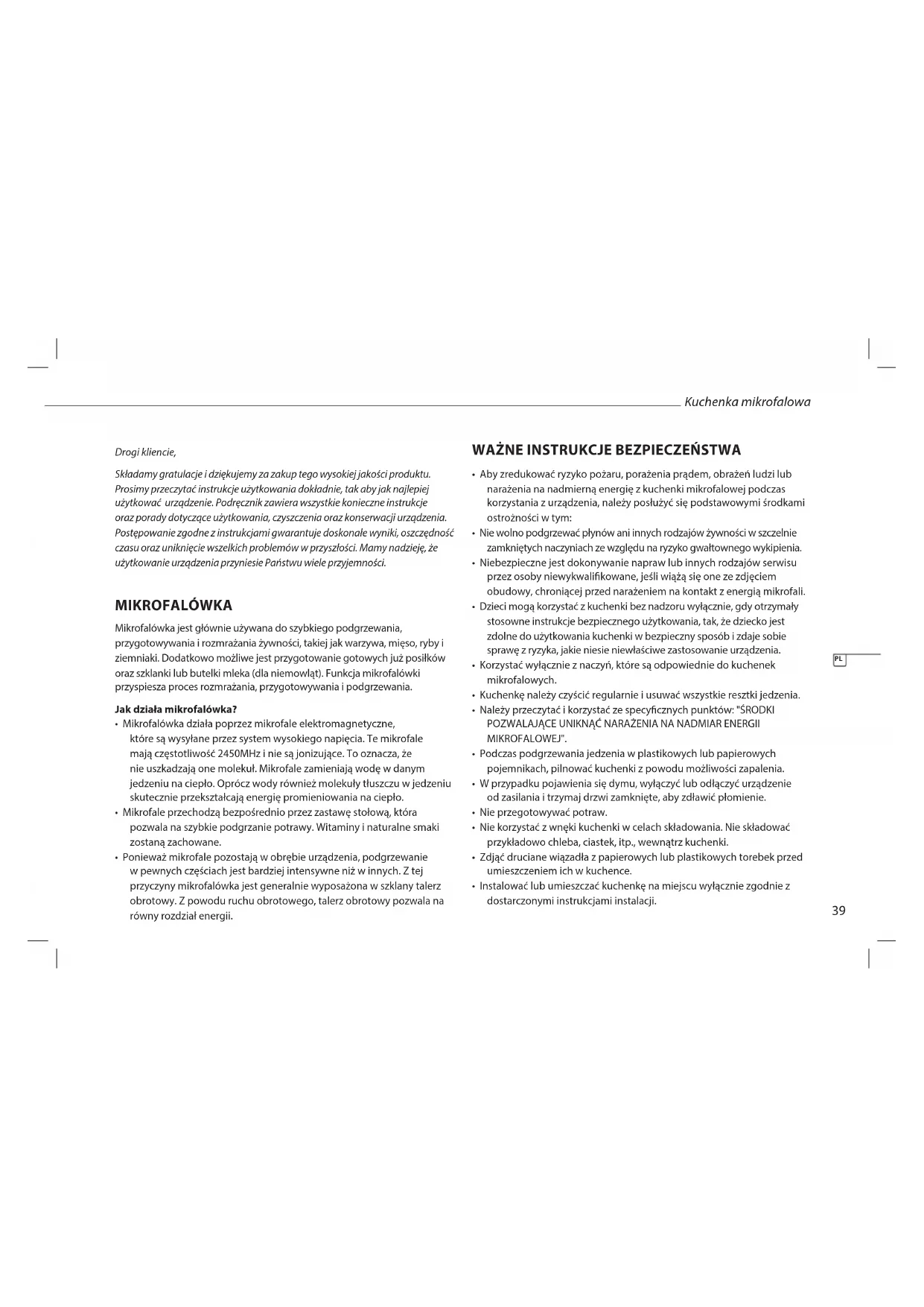 • Należy przeczytać i korzystać ze specycznych punktów: "ŚRODKI POZWALAJĄCE UNIKNĄĆ NARAŻENIA NA NADMIAR ENERGII MIKROFALOWEJ".