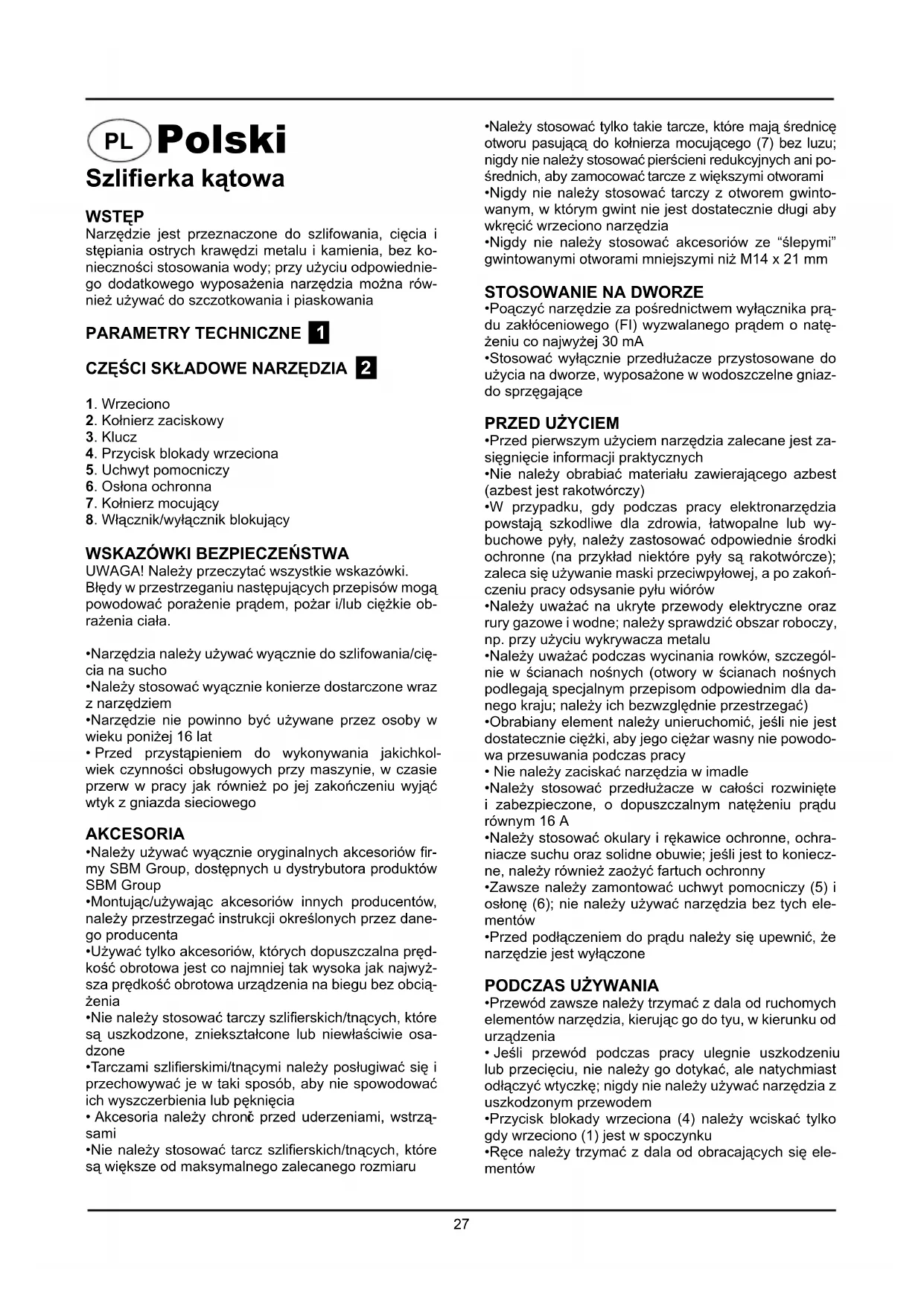 - Po wyłączeniu narzędzia nigdy nie należy zatrzymy- wać wirujących elementów działając na nie z bocznie przyłożoną siłą Urządzenie jest podwójnie izolowane zgodnie z normą EN 50144; dlatego też nie jest koniecz- ne jego uziemienie.KONSERWACJA Przed rozpoczęciem prac konserwacyjnych silnika należy upewnić się, że urządzenie nie znajduje się pod prądem. Urządzenia SBM Group zostały zaprojektowane do działania przez dłuższy okres czasu przy minimalnym nakładzie pracy związanym z konserwacją. Zadowala- jące działanie zależy od odpowiedniego dbania o urzą- dzenie oraz regularnego czyszczenia. Należy regularnie czyścić obudowę urządzenia miękką szmatką, najlepiej po każdym użyciu. Należy dopilno- wać, aby otwory wentylacyjne nie były zatkane przez pył i brud. W przypadku, gdy brud nie daje się usunąć, należy użyć miękkiej szmatki zwilżonej wodą z mydłem. Nie wolno używać rozpuszczalników takich jak benzy-na, alkohol, woda z amoniakiem itd. Rozpuszczalniki te mogą uszkodzić części wykonane z plastiku.Urządzenie nie wymaga dodatkowego smarowania. W przypadku pojawienia się usterki, np. zużycia czę- ści, należy skontaktować się z najbliższym sprzedawcą SBM Group. ŚRODOWISKOW celu zabezpieczenia urządzenia przed uszkodzenia-mi w czasie transportu, jest ono dostarczane w odpo- wiednio mocnym opakowaniu. Większość materiałów można poddać ponownej utylizacji. Należy umieścić materiały w odpowiednich dla ich właściwości pojemni- kach utylizacyjnych. Nie używany jużsprzęt można od- nieść do miejscowego sprzedawcy SBM Group. Zosta-nie on odpowiednio zutylizowany w sposób bezpieczny dla środowiska.29