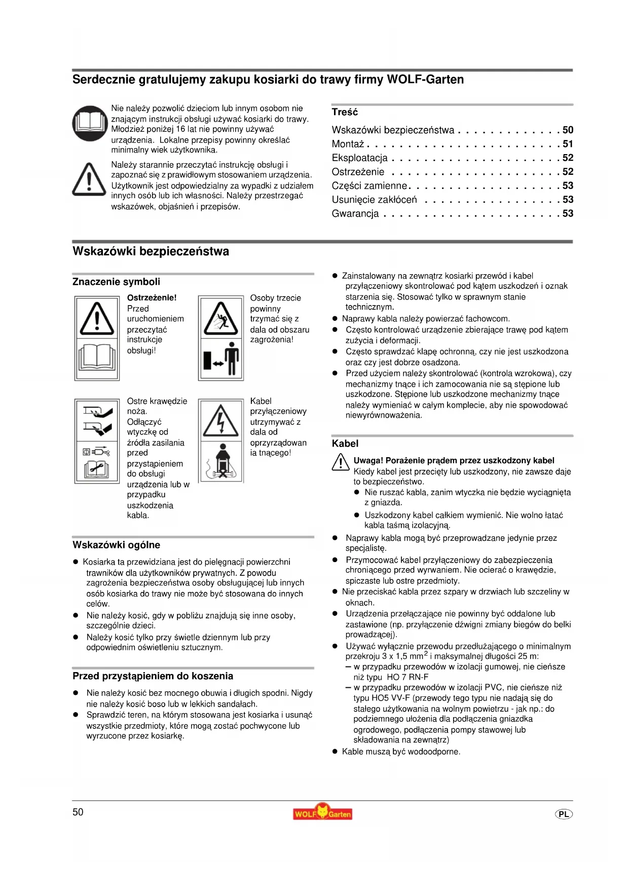 - Serdecznie gratulujemy zakupu kosiarki do trawy firmy WOLF-Garten Treść Wskazówki bezpieczeństwa p. 50