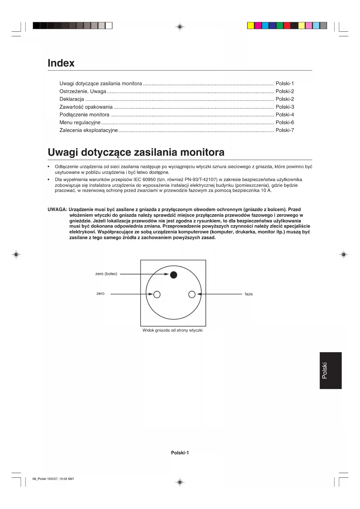 - Dla wype∏nienia warunków przepisów IEC 60950 (tzn. równie˝ PN-93/T-42107) w zakresie bezpieczeƒstwa u˝ytkownika zobowiàzuje si´ instalatora urzàdzenia do wyposa˝enia instalacji elektrycznej budynku (pomieszczenia), gdzie b´dzie pracowaç, w rezerwowà ochron´ przed zwarciami w przewodzie fazowym za pomocà bezpiecznika 10A. UWAGA: Urzàdzenie musi byç zasilane z gniazda z przy∏àczonym obwodem ochronnym (gniazdo z bolcem). Przed w∏o˝eniem wtyczki do gniazda nale˝y sprawdziç miejsce przy∏àczenia przewodów fazowego izerowego w gnieêdzie. Je˝eli lokalizacja przewodów nie jest zgodna zrysunkiem, to dla bezpieczeƒstwa u˝ytkowania musi byç dokonana odpowiednia zmiana. Przeprowadzenie powy˝szych czynnoÊci nale˝y zleciç specjaliÊcie elektrykowi. Wspó∏pracujàce ze sobà urzàdzenia komputerowe (komputer, drukarka, monitor itp.) muszà byç zasilane ztego samego êród∏a z zachowaniem powy˝szych zasad. zero (bolec) zero faza Widok gniazda od strony wtyczki Index Uwagi dotyczàce zasilania monitora ........................................................................................... Polski-1 Ostrze˝enie, Uwaga.................................................................................................................... Polski-2 Deklaracja ................................................................................................................................... Polski-2 ZawartoÊç opakowania ............................................................................................................... Polski-3 Pod∏àczenie monitora ................................................................................................................. Polski-4 Menu regulacyjne........................................................................................................................ Polski-6 Zalecenia eksploatacyjne............................................................................................................ Polski-7 09_Polish 18/6/07, 10:58 AM1Polski-2 OSTRZE˚ENIE UWAGA UWAGA: W CELU UNIKNI¢CIA NIEBEZPIECZE¡STWA PORA˚ENIA PRÑDEM ELEKTRYCZNYM UPEWNIJ SI¢, ˚E WTYCZKA PRZEWODU ZASILAJÑCEGO ZOSTA¸A WYCIÑGNI¢TA Z GNIAZDKA. ABY CA¸KOWICIE OD¸ÑCZYå ZASILANIE, NALE˚Y WYCIÑGNÑå WTYCZK¢ Z GNIAZDKA ZASILAJÑCEGO NIE WOLNO ZDEJMOWAå OS¸ONY (ANI TYLNEJ ÂCIANKI). WEWNÑTRZ MONITORA NIE MA ˚ADNYCH ELEMENTÓW, KTÓRE U˚YTKOWNIK MÓG¸BY SAMODZIELNIE NAPRAWIAå. WSZELKIE PRACE SERWISOWE MO¯E WYKONYWA˚ JEDYNIE WYKWALIFIKOWANY PERSONEL. Ten symbol ostrzega u˝ytkownika, ˝e nieizolowane elementy wewnàtrz znajdujà si´ pod tak du˝ym napi´ciem, ˝e mo˝e ono spowodowaç pora˝enie pràdem elektrycznym. Jakikolwiek bezpoÊredni kontakt z dowolnym elementem wewnàtrz obudowy jest niebezpieczny. Ten symbol ostrzega u˝ytkownika, ˝e istotne informacje dotyczàce pracy i obs∏ugi monitora znajdujà si´ w za∏àczonej literaturze. W zwiàzku z tym nale˝y si´ szczegó∏owo z nimi zapoznaç w celu unikni´cia problemów. W CELU UNIKNI¢CIA NIEBEZPIECZE¡STWA PO˚ARU LUB PORA˚ENIA PRÑDEM NIE NALE˚Y WYSTAWIAå MONITORA NA DESZCZ LUB NA DZIA¸ANIE WILGOCI. NALE˚Y TAK˚E SPRAWDZIå, CZY BOLCE WTYCZKI KABLA ZASILAJÑCEGO SÑ PRAWID¸OWO W¸O˚ONE DO GNIAZDA ZASILAJÑCEGO LUB GNIAZDA PRZED¸U˚ACZA. WTYCZKI NIE NALE˚Y WK¸ADAå DO GNIAZDA NA SI¸¢. NIE NALE˚Y OTWIERAå OBUDOWY, PONIEWA˚ WEWNÑTRZ ZNAJDUJÑ SI¢ ELEMENTY POD WYSOKIM NAPI¢CIEM. WSZELKIE PRACE SERWISOWE MO¯E WYKONYWA˚ JEDYNIE WYKWALIFIKOWANY PERSONEL. Windows jest zastrze˝onym znakiem handlowym firmy Microsoft Corporation. NEC jest zastrze˝onym znakiem handlowym firmy NEC Corporation. ENERGY STAR jest zarejestrowanym znakiem handlowym w USA. ErgoDesign jest rejestrowanà markà ochronnà spó∏ki NEC Display Solutions, Ltd. w Austrii, Beneluksie, Danii, Francji, Niemczech, W∏oszech, Norwegii, Hiszpanii, Szwecji i Wielkiej Brytanii. Pozosta∏e nazwy marek i produktów wymienione w niniejszym dokumencie sà znakami handlowymi lub zastrze˝onymi znakami handlowymi odpowiednich w∏aÊcicieli praw autorskich. NEC Display Solutions of America, Inc., jako partner ENERGY STAR
