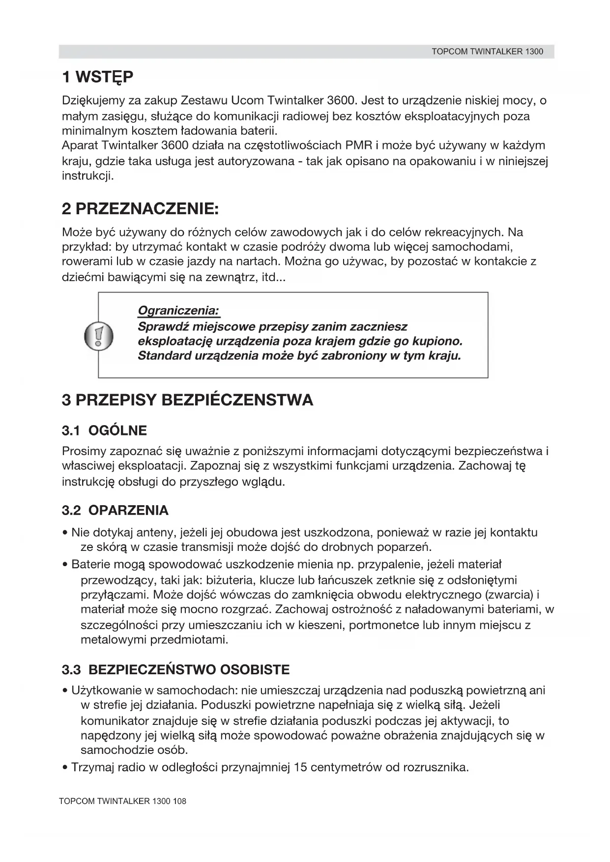 446.00625MHz - 446.09375 MHz Do 3 Km (Otvorené priestranstvo) 3 x AAA Alkalické alebo NiMH dobíjacie =< 500mW ERP FM - F3E 12,5 Khz Symbol CE znamená, že prístroj je v súlade so základnými požiadavkami R&TTE direktiv. HL_TT_1300_all.book Page 107 Wednesday, August 25, 2004 10:53 AMTOPCOM TWINTALKER 1300 108TOPCOM TWINTALKER 1300 POLSKI 1 WST‰P Dzi™kujemy za zakup Zestawu Ucom Twintalker 3600. Jest to urzådzenie niskiej mocy, o ma∆ym zasi™gu, s∆u†åce do komunikacji radiowej bez kosztów eksploatacyjnych poza minimalnym kosztem ∆adowania baterii. Aparat Twintalker 3600 dzia∆a na cz™stotliwo∂ciach PMR i mo†e byç u†ywany w ka†dym kraju, gdzie taka us∆uga jest autoryzowana - tak jak opisano na opakowaniu i w niniejszej instrukcji. 2 PRZEZNACZENIE: Mo†e byç u†ywany do ró†nych celów zawodowych jak i do celów rekreacyjnych. Na przyk∆ad: by utrzymaç kontakt w czasie podró†y dwoma lub wi™cej samochodami, rowerami lub w czasie jazdy na nartach. Mo†na go u†ywac, by pozostaç w kontakcie z dzieçmi bawiåcymi si™ na zewnåtrz, itd...