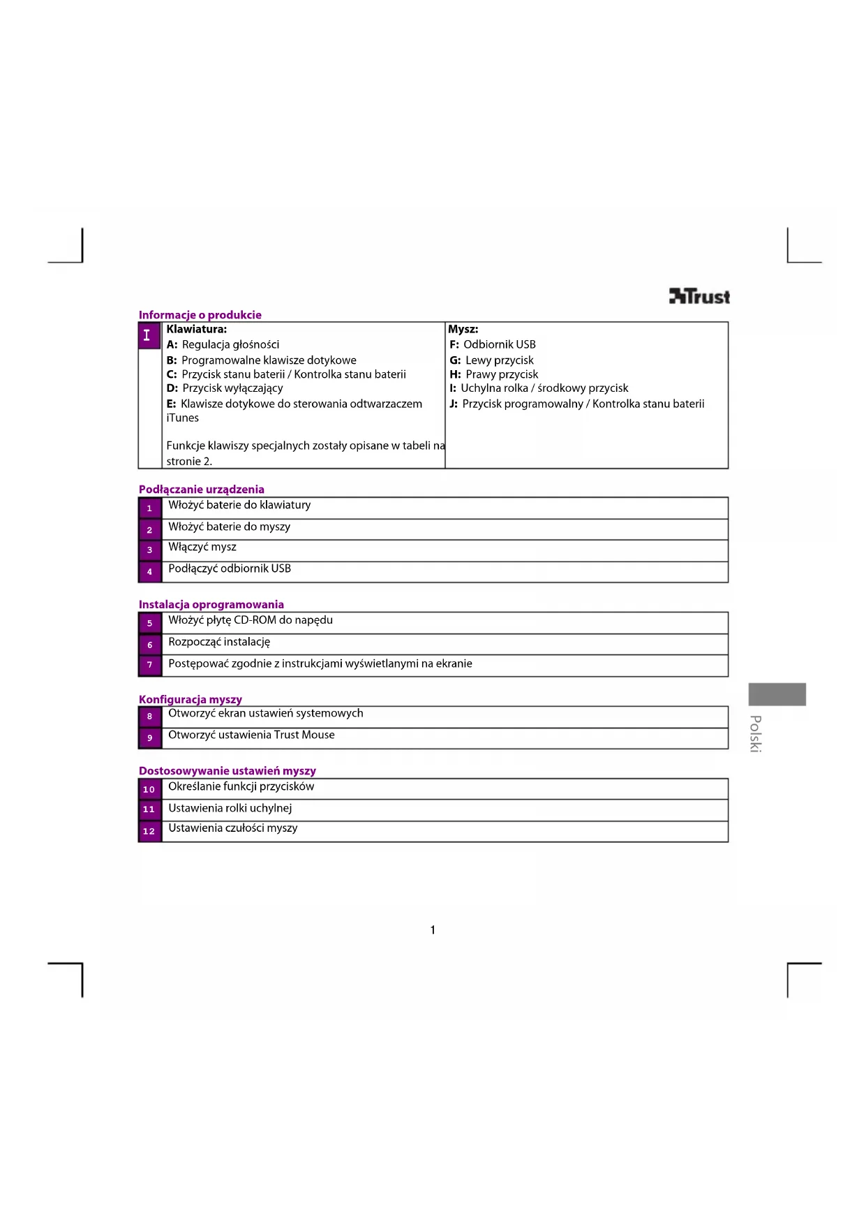 Informacje o produkcie Klawiatura: A: Regulacja głośności B: Programowalne klawisze dotykowe C: Przycisk stanu baterii / Kontrolka stanu baterii D: Przycisk wyłączający E: Klawisze dotykowe do sterowania odtwarzaczem iTunes Funkcje klawiszy specjalnych zostały opisane w tabeli na stronie 2. Mysz: F: Odbiornik USB G: Lewy przycisk H: Prawy przycisk I: Uchylna rolka / środkowy przycisk J: Przycisk programowalny / Kontrolka stanu baterii Podłączanie urządzenia Włożyć baterie do klawiatury Włożyć baterie do myszy Włączyć mysz Podłączyć odbiornik USB Instalacja oprogramowania Włożyć płytę CD-ROM do napędu Rozpocząć instalację Postępować zgodnie z instrukcjami wyświetlanymi na ekranie Konfiguracja myszy Otworzyć ekran ustawień systemowych Otworzyć ustawienia Trust Mouse Dostosowywanie ustawień myszy Określanie funkcji przycisków Ustawienia rolki uchylnej Ustawienia czułości myszy