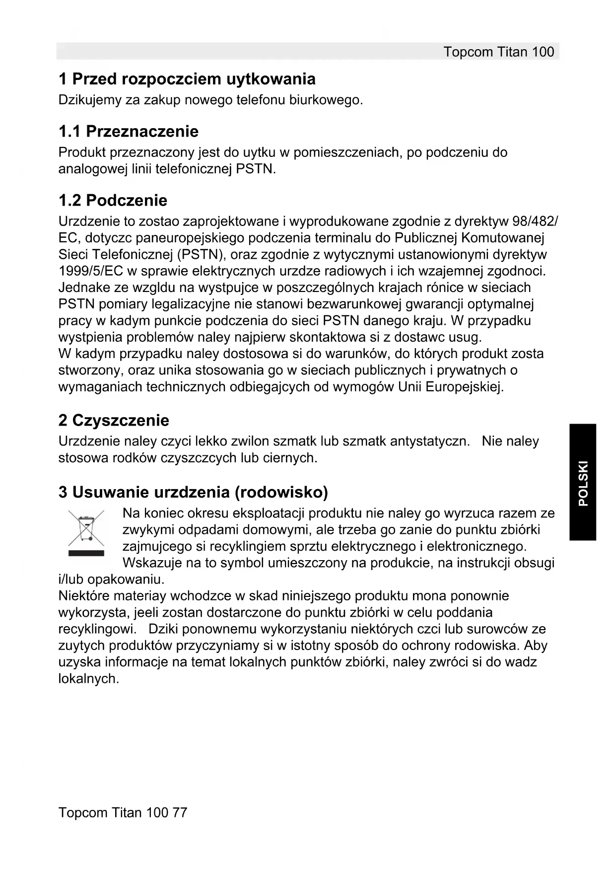 Urzdzenie to zostao zaprojektowane i wyprodukowane zgodnie z dyrektyw 98/482/ EC, dotyczc paneuropejskiego podczenia terminalu do Publicznej Komutowanej Sieci Telefonicznej (PSTN), oraz zgodnie z wytycznymi ustanowionymi dyrektyw 1999/5/EC w sprawie elektrycznych urzdze radiowych i ich wzajemnej zgodnoci. Jednake ze wzgldu na wystpujce w poszczególnych krajach rónice w sieciach PSTN pomiary legalizacyjne nie stanowi bezwarunkowej gwarancji optymalnej pracy w kadym punkcie podczenia do sieci PSTN danego kraju. W przypadku wystpienia problemów naley najpierw skontaktowa si z dostawc usug. W kadym przypadku naley dostosowa si do warunków, do których produkt zosta stworzony, oraz unika stosowania go w sieciach publicznych i prywatnych o wymaganiach technicznych odbiegajcych od wymogów Unii Europejskiej. 2 Czyszczenie Urzdzenie naley czyci lekko zwilon szmatk lub szmatk antystatyczn. Nie naley stosowa rodków czyszczcych lub ciernych. 3 Usuwanie urzdzenia (rodowisko) Na koniec okresu eksploatacji produktu nie naley go wyrzuca razem ze zwykymi odpadami domowymi, ale trzeba go zanie do punktu zbiórki zajmujcego si recyklingiem sprztu elektrycznego i elektronicznego. Wskazuje na to symbol umieszczony na produkcie, na instrukcji obsugi i/lub opakowaniu. Niektóre materiay wchodzce w skad niniejszego produktu mona ponownie wykorzysta, jeeli zostan dostarczone do punktu zbiórki w celu poddania recyklingowi. Dziki ponownemu wykorzystaniu niektórych czci lub surowców ze zuytych produktów przyczyniamy si w istotny sposób do ochrony rodowiska. Aby uzyska informacje na temat lokalnych punktów zbiórki, naley zwróci si do wadz lokalnych.78 Topcom Titan 100 Topcom Titan 100 4 Porady dotyczce bezpieczestwa