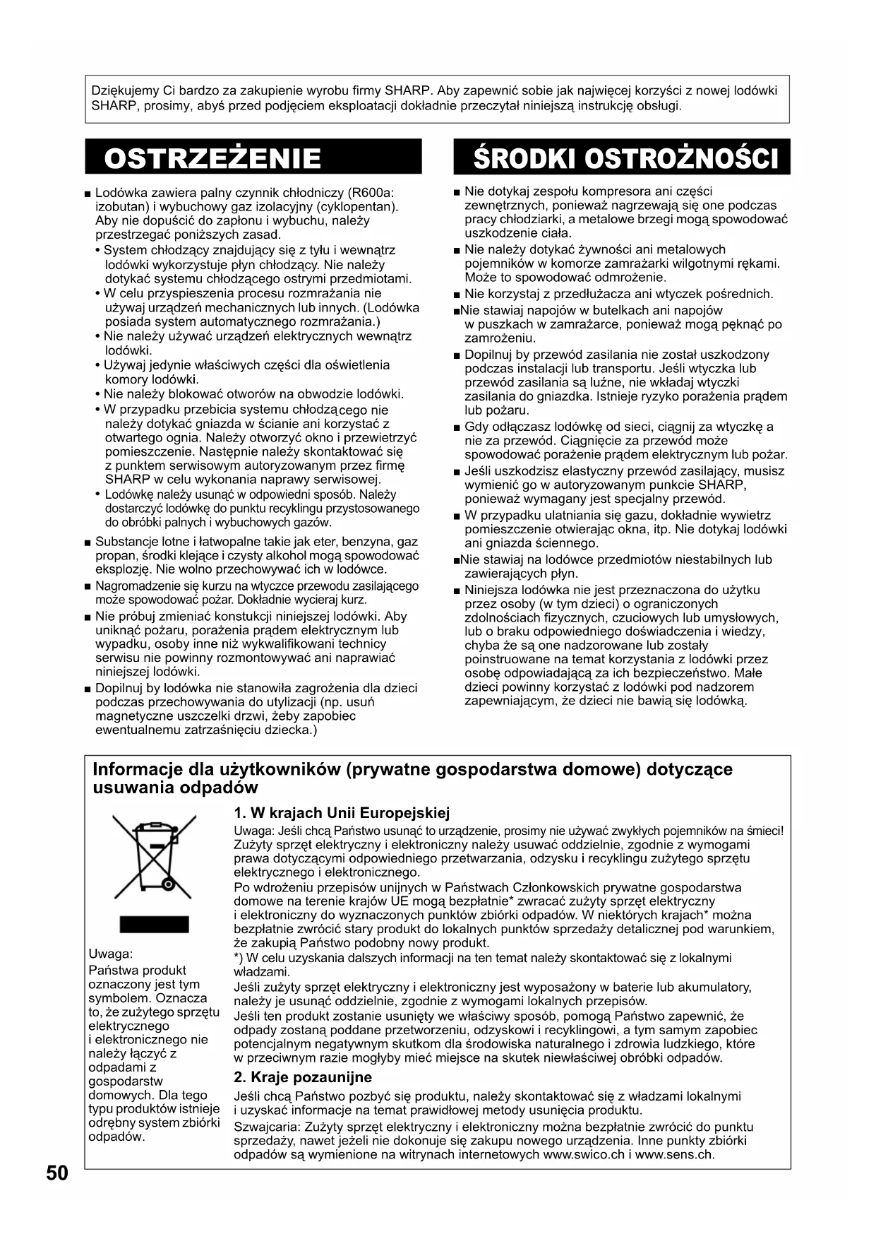 Dziękujemy Ci bardzo za zakupienie wyrobu firmy SHARP. Aby zapewnić sobie jak najwięcej korzyści z nowej lodówki