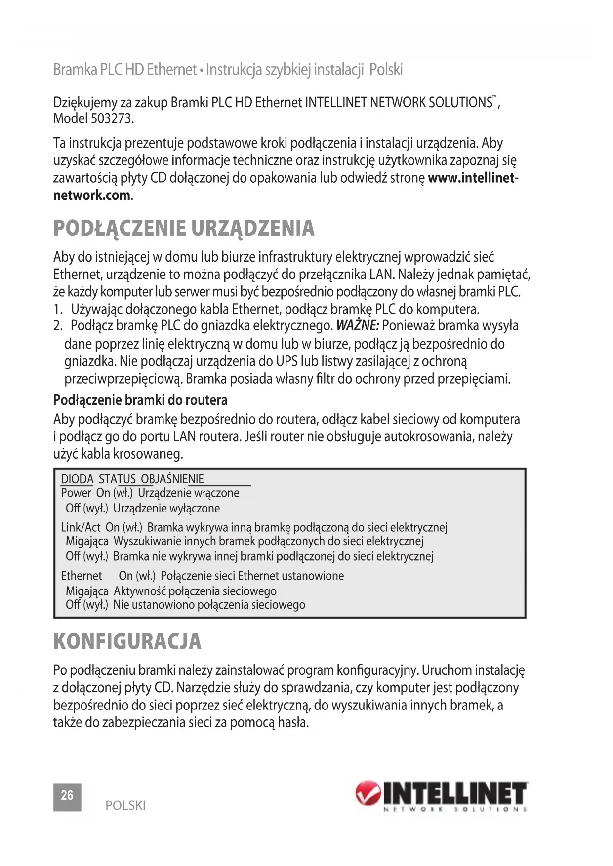 Model 503273. Ta instrukcja prezentuje podstawowe kroki podłączenia i instalacji urządzenia. Aby uzyskać szczegółowe informacje techniczne oraz instrukcję użytkownika zapoznaj się zawartością płyty CD dołączonej do opakowania lub odwiedź stronę www.intellinet- network.com. PodŁĄcZenie urZĄdZenia Aby do istniejącej w domu lub biurze infrastruktury elektrycznej wprowadzić sieć Ethernet, urządzenie to można podłączyć do przełącznika LAN. Należy jednak pamiętać, że każdy komputer lub serwer musi być bezpośrednio podłączony do własnej bramki PLC.
