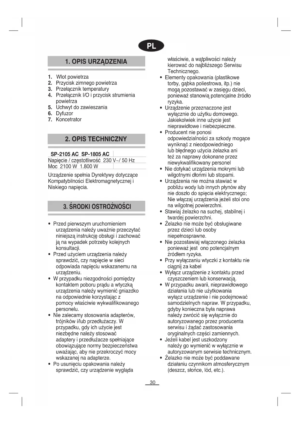 Urządzenie spełnia Dyrektywy dotyczące Kompatybilności Elektromagnetycznej i Niskiego napięcia. SP-2105 AC SP-1805 AC Napięcie / częstotliwość 230 V~/ 50 Hz Moc 2100 W 1.800 W31
