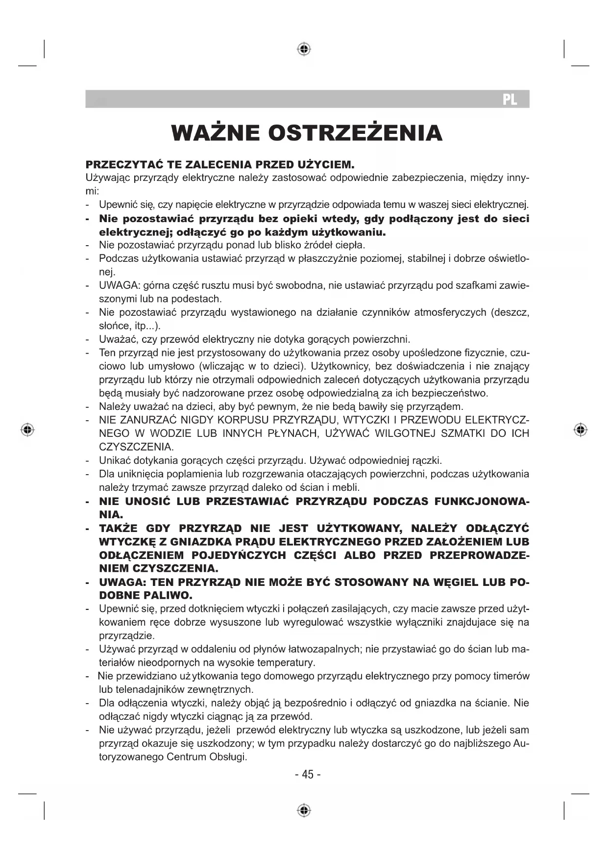 - 44 -WAŻNE OSTRZEŻENIA PRZECZYTAĆ TE ZALECENIA PRZED UŻYCIEM.