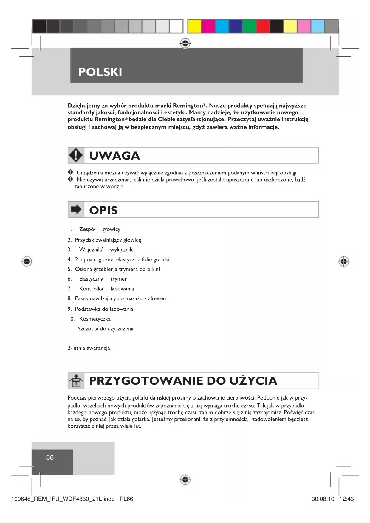 Pobierz instrukcję dla swojego Maszynka do golenia w formacie PDF za darmo! Znajdź swoją instrukcję WDF4830C - REMINGTON i weź swoje urządzenie elektroniczne z powrotem w ręce. Na tej stronie opublikowane są wszystkie dokumenty niezbędne do korzystania z urządzenia. WDF4830C marki REMINGTON.