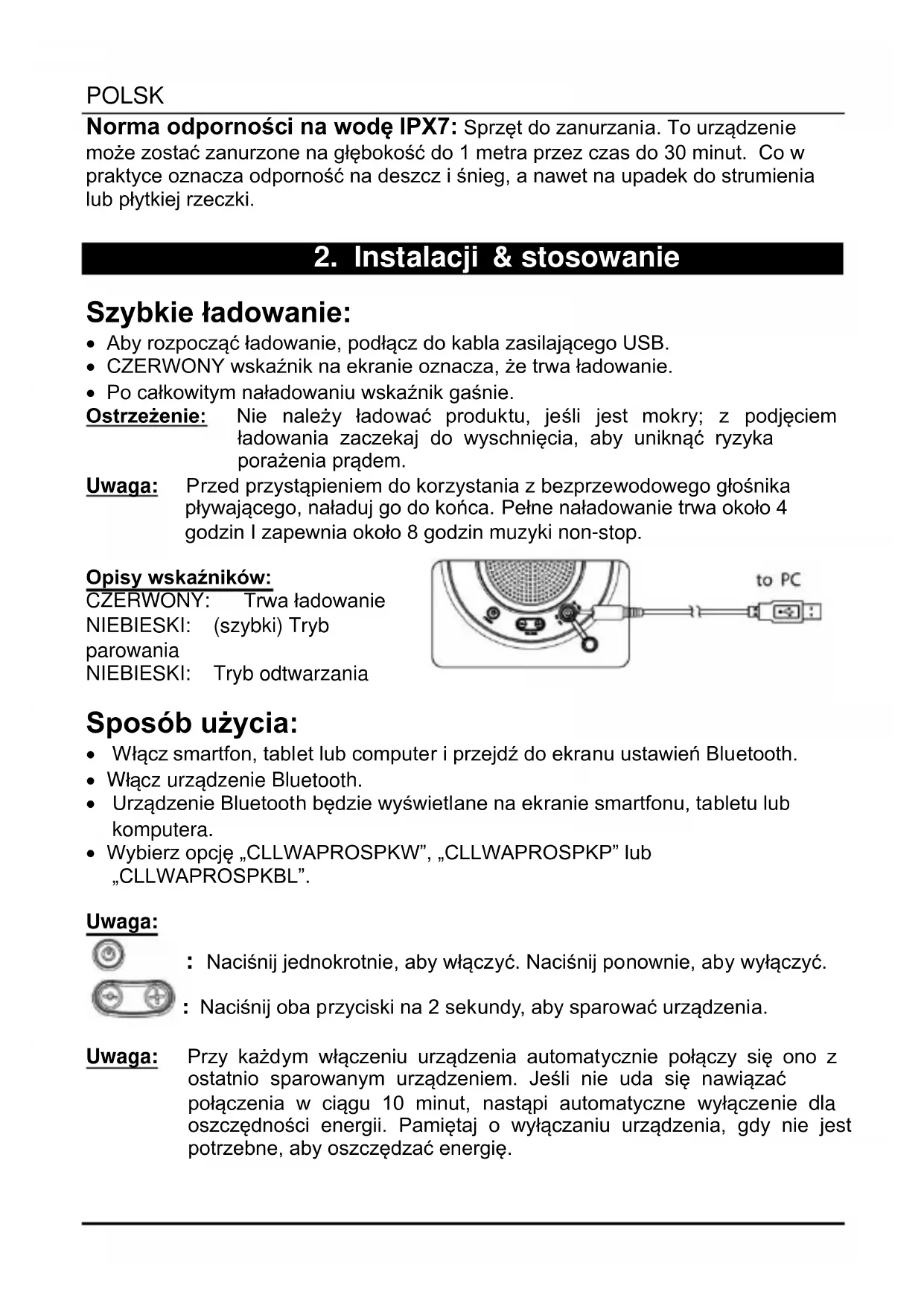 Szybkie ładowanie: Aby rozpocząć ładowanie, podłącz do kabla zasilającego USB. CZERWONY wskaźnik na ekranie oznacza, że trwa ładowanie. Po całkowitym naładowaniu wskaźnik gaśnie. Ostrzeżenie: Nie należy ładować produktu, jeśli jest mokry; z podjęciem ładowania zaczekaj do wyschnięcia, aby uniknąć ryzyka porażenia prądem. Uwaga: Przed przystąpieniem do korzystania z bezprzewodowego głośnika pływającego, naładuj go do końca. Pełne naładowanie trwa około 4 godzin I zapewnia około 8 godzin muzyki non-stop. Opisy wskaźników: CZERWONY: Trwa ładowanie NIEBIESKI: (szybki) Tryb parowania NIEBIESKI: Tryb odtwarzania Sposób użycia: Włącz smartfon, tablet lub computer i przejdź do ekranu ustawień Bluetooth. Włącz urządzenie Bluetooth. Urządzenie Bluetooth będzie wyświetlane na ekranie smartfonu, tabletu lub komputera. Wybierz opcję „CLLWAPROSPKW”, „CLLWAPROSPKP” lub „CLLWAPROSPKBL”. Uwaga: : Naciśnij jednokrotnie, aby włączyć. Naciśnij ponownie, aby wyłączyć. : Naciśnij oba przyciski na 2 sekundy, aby sparować urządzenia. Uwaga: Przy każdym włączeniu urządzenia automatycznie połączy się ono z ostatnio sparowanym urządzeniem. Jeśli nie uda się nawiązać połączenia w ciągu 10 minut, nastąpi automatyczne wyłączenie dla oszczędności energii. Pamiętaj o wyłączaniu urządzenia, gdy nie jest potrzebne, aby oszczędzać energię.POLSK Odbieranie połączeń: Jeśli w trakcie słuchania muzyki pojawi się połączenie przychodzące, muzyka zostanie zatrzymana. Odtwarzanie będzie podjęte po zakończeniu rozmowy.POLSK