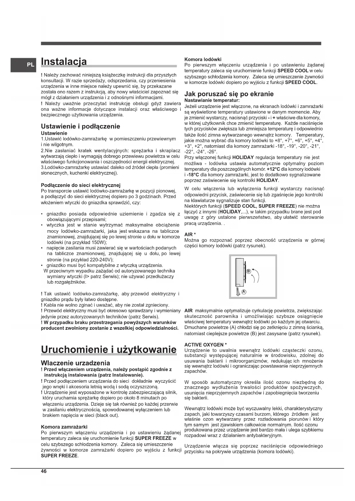 - gniazdko musi być kompatybilne z wtyczką urządzenia. W przeciwnym wypadku zażądać od autoryzowanego technika wymiany wtyczki (I> patrz Serwis); nie używać przedłużaczy lub rozgałęźników. ! Tak ustawić lodówko-zamrażarkę, aby przewód elektryczny i gniazdko prądu były łatwo dostępne. ! Kabla nie wolno zginać i uważać, aby nie został zgnieciony. ! Przewód elektryczny musi być okresowo sprawdzany i wymieniany jedynie przez autoryzowanych techników (patrz Serwis). ! W przypadku braku przestrzegania powyższych warunków producent zwolniony zostanie z wszelkiej odpowiedzialności. Uruchomienie i użytkowanie Wlaczenie urzadzenia ! Przed włączeniem urządzenia, należy postąpić zgodnie z instrukcją instalowania (patrz Instalowanie). ! Przed podłączeniem urządzenia do sieci dokładnie wyczyścić jego wnęki i akcesoria letnią wodą i sodą oczyszczoną. ! Urządzenie jest wyposażone w kontrolę zabezpieczającą silnik, który uruchamia sprężarkę dopiero po około 8 minutach po włączeniu urządzenia. Dzieje się tak również po każdej przerwie w zasilaniu elektrycznością, spowodowanej wyłączeniem lub brakiem napięcia w sieci (black out). Komora zamrażarki Po pierwszym włączeniu urządzenia i po ustawieniu żądanej temperatury zaleca się uruchomienie funkcji SUPER FREEZE w celu szybszego schłodzenia komory. Zaleca się umieszczenie żywności w komorze zamrażarki dopiero po wyjściu z funkcji SUPER FREEZE. Komora lodówki Po pierwszym włączeniu urządzenia i po ustawieniu żądanej temperatury zaleca się uruchomienie funkcji SPEED COOL w celu szybszego schłodzenia komory. Zaleca się umieszczenie żywności w komorze lodówki dopiero po wyjściu z funkcji SPEED COOL. Jak poruszać się po ekranie Nastawianie temperatur: Jeżeli urządzenie jest włączone, na ekranach lodówki i zamrażarki są wyświetlone temperatury ustawione w danym momencie. Aby je zmienić wystarczy, nacisnąć przyciski - i + właściwe dla komory, w której użytkownik chce zmienić temperaturę. Każde naciśnięcie tych przycisków zwiększa lub zmniejsza temperaturę i odpowiednio także ilość zimna wytwarzanego wewnątrz komory. Temperatury, jakie można wybrać dla komory lodówki to +8°, +7°, +6°, +5°, +4°, +3°, +2°, natomiast dla komory zamrażarki -18°, -19°, -20°, -21°, -22°, -24°, -26°. Przy włączonej funkcji HOLIDAY regulacja temperatury nie jest możliwa - lodówka ustawia automatycznie optymalny poziom temperatury dla poszczególnych komór. +12°C dla komory lodówki i -18°C dla komory zamrażarki, jest to dodatkowo sygnalizowane poprzez zaświecenie się kontrolki HOLIDAY. W celu włączenia lub wyłączenia funkcji wystarczy nacisnąć odpowiedni przycisk, zaświecenie się lub zgaśnięcie jego kontrolki na klawiaturze sygnalizuje stan funkcji. Niektórych funkcji (SPEED COOL, SUPER FREEZE) nie można łączyć z innymi (HOLIDAY,...), w takim przypadku brane jest pod uwagę z góry ustalone pierwszeństwo, aby ułatwić sterowanie pracą urządzenia. . AIR * Można go rozpoznać poprzez obecność urządzenia w górnej części komory lodówki (patrz rysunek).