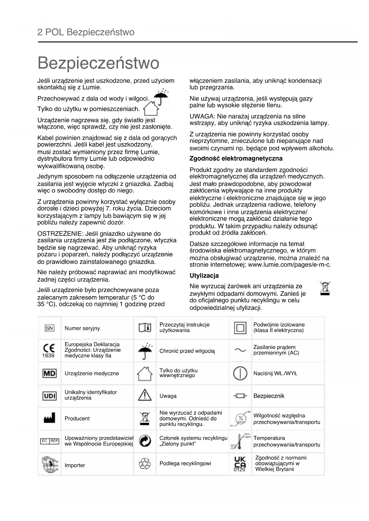 Jeśli urządzenie jest uszkodzone, przed użyciem skontaktuj się z Lumie. Przechowywać z dala od wody i wilgoci. Tylko do użytku w pomieszczeniach. Urządzenie nagrzewa się, gdy światło jest włączone, więc sprawdź, czy nie jest zasłonięte. Kabel powinien znajdować się z dala od gorących powierzchni. Jeśli kabel jest uszkodzony, musi zostać wymieniony przez firmę Lumie, dystrybutora firmy Lumie lub odpowiednio wykwalifikowaną osobę. Jedynym sposobem na odłączenie urządzenia od zasilania jest wyjęcie wtyczki z gniazdka. Zadbaj więc o swobodny dostęp do niego. Z urządzenia powinny korzystać wyłącznie osoby dorosłe i dzieci powyżej 7. roku życia. Dzieciom korzystającym z lampy lub bawiącym się w jej pobliżu należy zapewnić dozór. OSTRZEŻENIE: Jeśli gniazdko używane do zasilania urządzenia jest źle podłączone, wtyczka będzie się nagrzewać. Aby uniknąć ryzyka pożaru i poparzeń, należy podłączyć urządzenie do prawidłowo zainstalowanego gniazdka. Nie należy próbować naprawiać ani modyfikować żadnej części urządzenia. Jeśli urządzenie było przechowywane poza zalecanym zakresem temperatur (5 °C do 35 °C), odczekaj co najmniej 1 godzinę przed włączeniem zasilania, aby uniknąć kondensacji lub przegrzania. Nie używaj urządzenia, jeśli występują gazy palne lub wysokie stężenie tlenu. UWAGA: Nie narażaj urządzenia na silne wstrząsy, aby uniknąć ryzyka uszkodzenia lampy. Z urządzenia nie powinny korzystać osoby nieprzytomne, znieczulone lub niepanujące nad swoimi czynami np. będące pod wpływem alkoholu. Zgodność elektromagnetyczna Produkt zgodny ze standardem zgodności elektromagnetycznej dla urządzeń medycznych. Jest mało prawdopodobne, aby powodował zakłócenia wpływające na inne produkty elektryczne i elektroniczne znajdujące się w jego pobliżu. Jednak urządzenia radiowe, telefony komórkowe i inne urządzenia elektryczne/ elektroniczne mogą zakłócać działanie tego produktu. W takim przypadku należy odsunąć produkt od źródła zakłóceń. Dalsze szczegółowe informacje na temat środowiska elektromagnetycznego, w którym można obsługiwać urządzenie, można znaleźć na stronie internetowej: www.lumie.com/pages/e-m-c. Utylizacja Nie wyrzucaj żarówek ani urządzenia ze zwykłymi odpadami domowymi. Zanieś je do oficjalnego punktu recyklingu w celu odpowiedzialnej utylizacji.POL 3 Środki ostrożności Badania pokazują, że światłoterapia jest bardzo bezpieczna. Skonsultuj się najpierw z lekarzem, jeśli występuje którykolwiek z poniższych objawów: Masz poważną wadę wzroku lub przebytą operację oczu. Zalecono Ci unikanie jasnego światła lub przyjmujesz leki, które mogą powodować nadwrażliwość na światło. Masz zdiagnozowaną depresję lub inne zaburzenia nastroju/snu. Informacja na temat leków przyjmowanych na te choroby jest szczególnie ważna, gdyż terapia światłem może także wpływać na nastrój. U nielicznych osób występują skutki uboczne, ale są one na ogół łagodne (w tym bóle głowy, zmęczenie oczu, nudności i nadpobudliwość) i zazwyczaj ustępują po wyłączeniu światła. Przez kilka kolejnych dni należy stopniowo wydłużać czas spędzany przed lampą, aby ustalić optymalny dla siebie czas naświetlania. Część użytkowników skarży się na trudności z zasypianiem, które są często spowodowane korzystaniem z lampy zbyt blisko pory snu. W razie jakichkolwiek problemów podczas korzystania z lampy Brazil lub w przypadku braku korzyści z naświetlania po tygodniu używania, skontaktuj się z firmą Lumie lub porozmawiaj z lekarzem. WAŻNE: Wskazówki zawarte w tej ulotce nie są zaleceniami medycznymi dotyczącymi leczenia jakichkolwiek schorzeń. Jeśli lekarz zasugerował stosowanie światłoterapii, należy postępować zgodnie z jego zaleceniami i omawiać z nim wszelkie jej efekty.