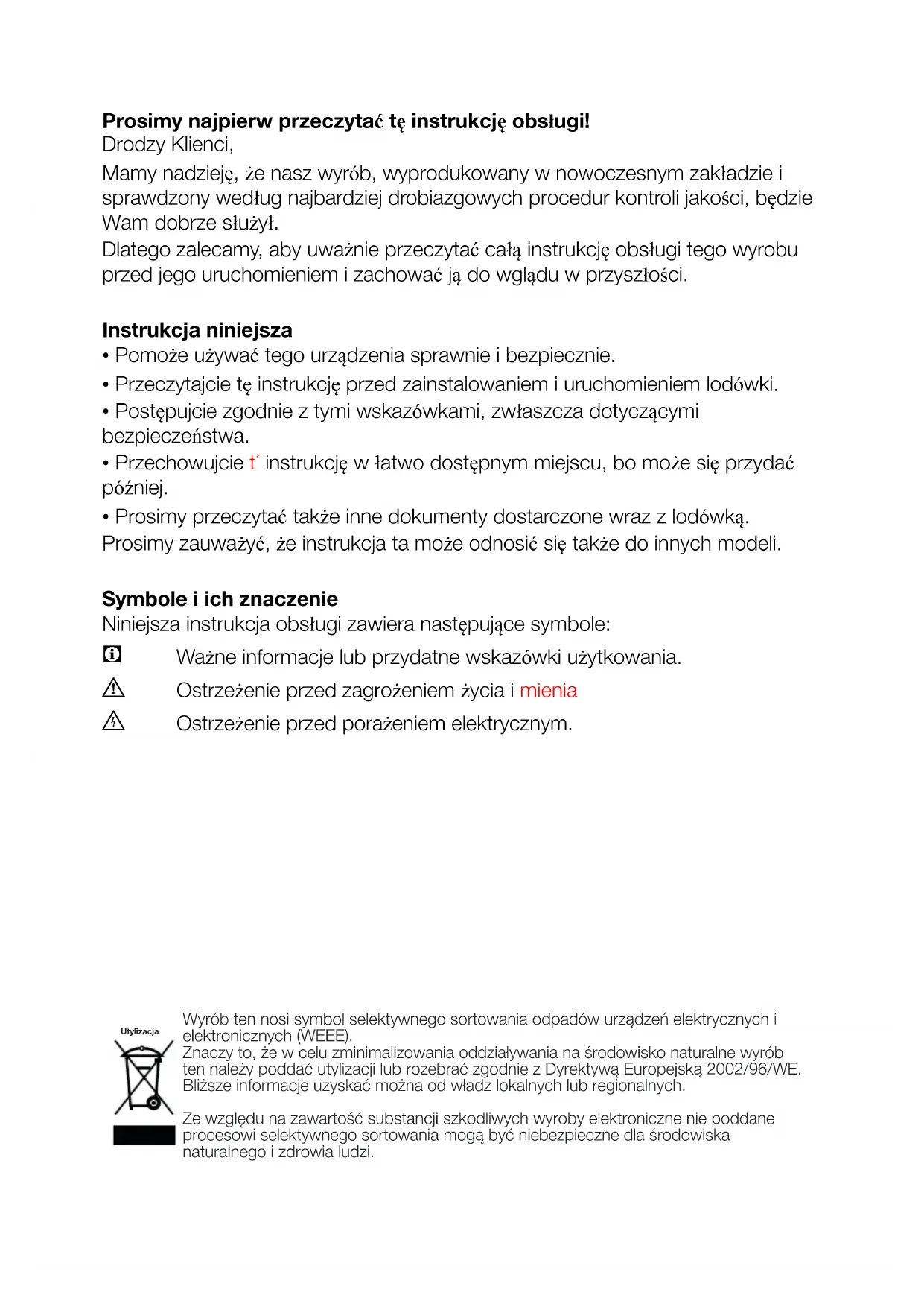 - Prosimy przeczytać także inne dokumenty dostarczone wraz z lodówką. Prosimy zauważyć, że instrukcja ta może odnosić się także do innych modeli. Symbole i ich znaczenie Niniejsza instrukcja obsługi zawiera następujące symbole: C Ważne informacje lub przydatne wskazówki użytkowania. A Ostrzeżenie przed zagrożeniem życia i mienia B Ostrzeżenie przed porażeniem elektrycznym. Wyrób ten nosi symbol selektywnego sortowania odpadów urządzeń elektrycznych i elektronicznych (WEEE). Znaczy to, że w celu zminimalizowania oddziaływania na środowisko naturalne wyrób ten należy poddać utylizacji lub rozebrać zgodnie z Dyrektywą Europejską 2002/96/WE. Bliższe informacje uzyskać można od władz lokalnych lub regionalnych. Ze względu na zawartość substancji szkodliwych wyroby elektroniczne nie poddane procesowi selektywnego sortowania mogą być niebezpieczne dla środowiska naturalnego i zdrowia ludzi. UtylizacjaPL