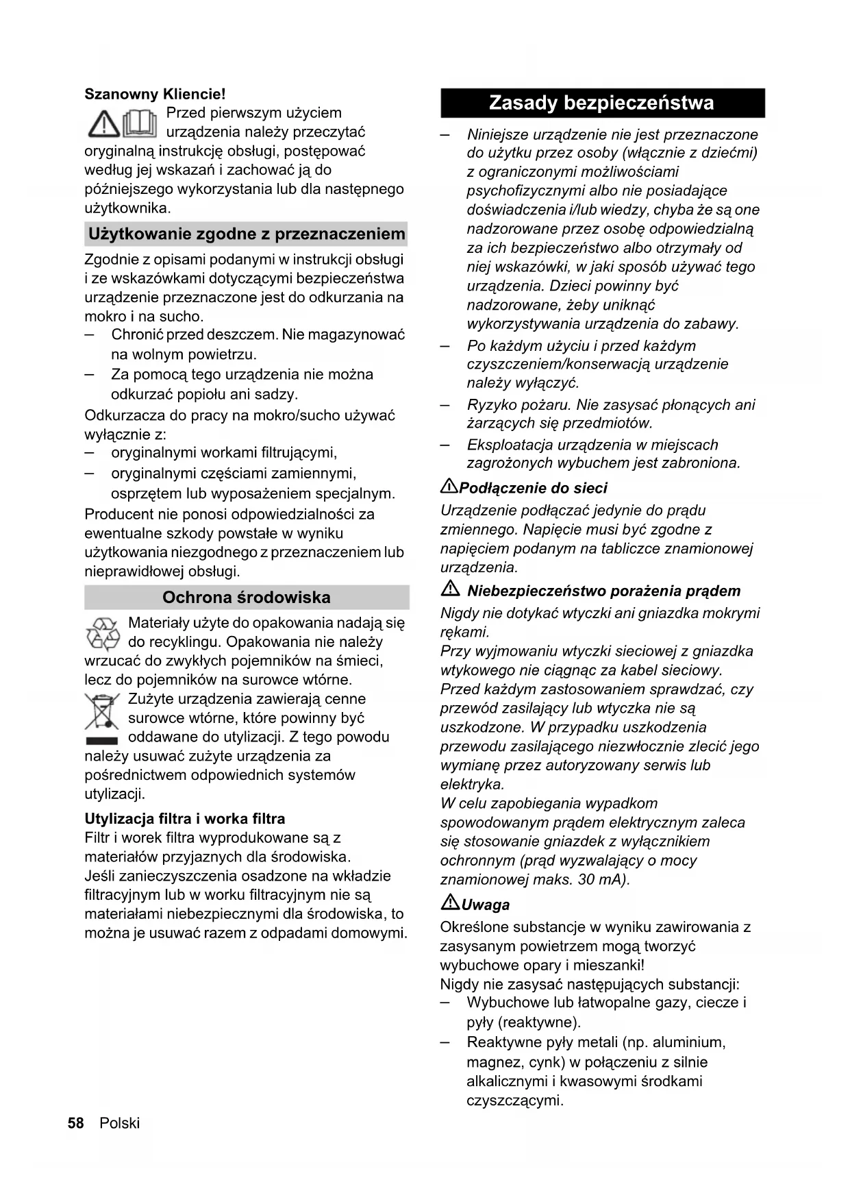 uchwytach na urządzeniu i przechowywać odkurzacz w suchym pomieszczeniu. Î W czasie transportu urządzenia w samochodzie należy je mocno zabezpieczyć. Ryzyko obrażeń Przed rozpoczęciem konserwacji lub naprawy wyłączyć urządzenie i odłączyć je od sieci.