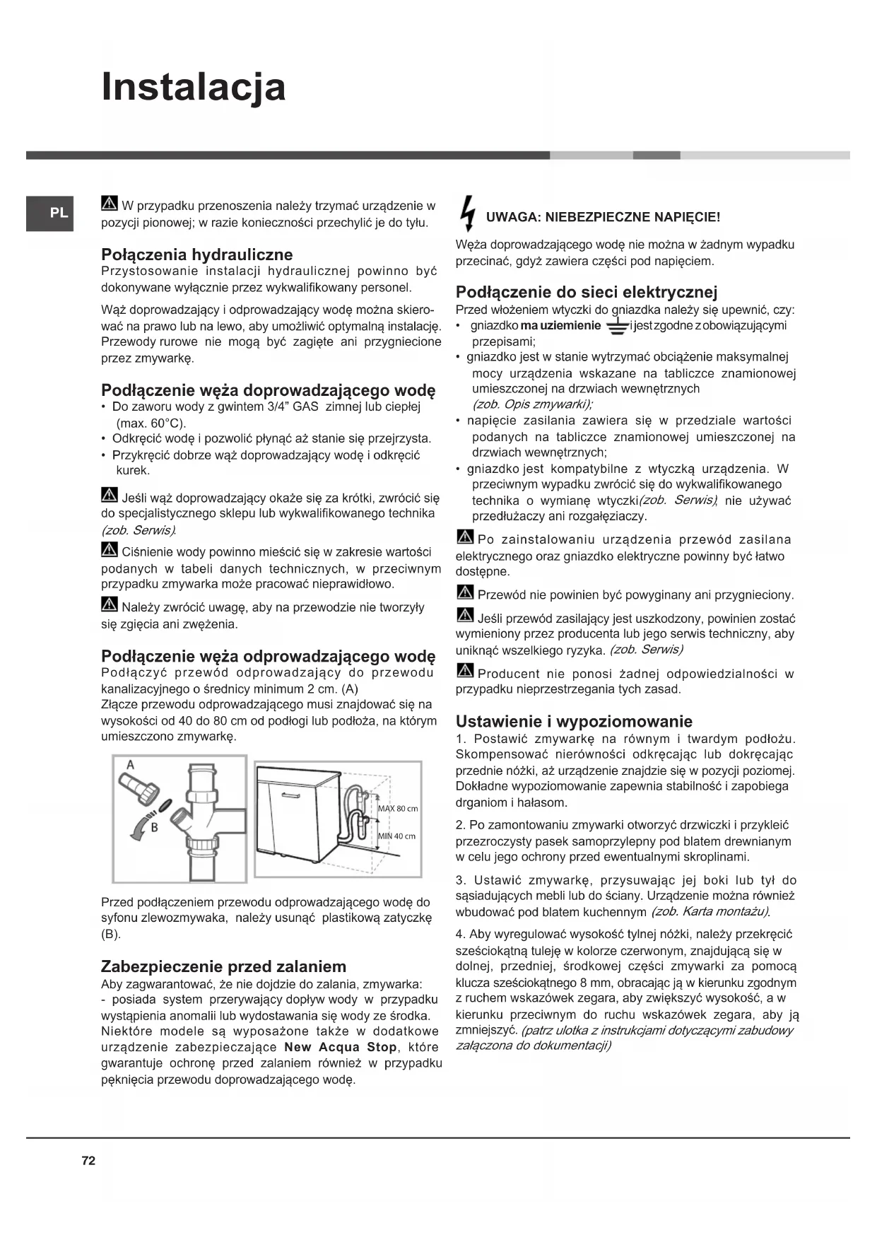 ZMYWARKA - Spis treści Instrukcja obsługi, 1Ważne Wskazówki Bezpieczeństwa, 10-11-12Serwis Techniczny, 13Karta produktu, 16Instalacja, 72-73Opis urządzenia, 74Sól regeneracyjna i środek nabłyszczający, 75Ładowanie koszy, 76-77Środek myjący i obsługa zmywarki, 78Programy, 79Programy specjalne i opcje, 80Konserwacja i obsługa, 81Nieprawidłowe działanie i możliwe środki zaradcze, 82