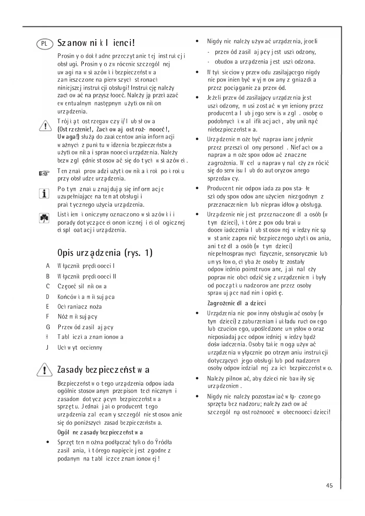 Trojk at ostrzegawczyi/1 ub stow a (Ostrzezenia!, Zach ow aj ostroz-nooec!, Uw aga!) sluz do zaak centow ania inform acji w aznych z punktu widzenia bezpieczeni stw a uzytk ow nik ai spraw nooeci urzadzenia. Nalezy bezw zgl ednie stosow ac sie do tych wsk azow ek.