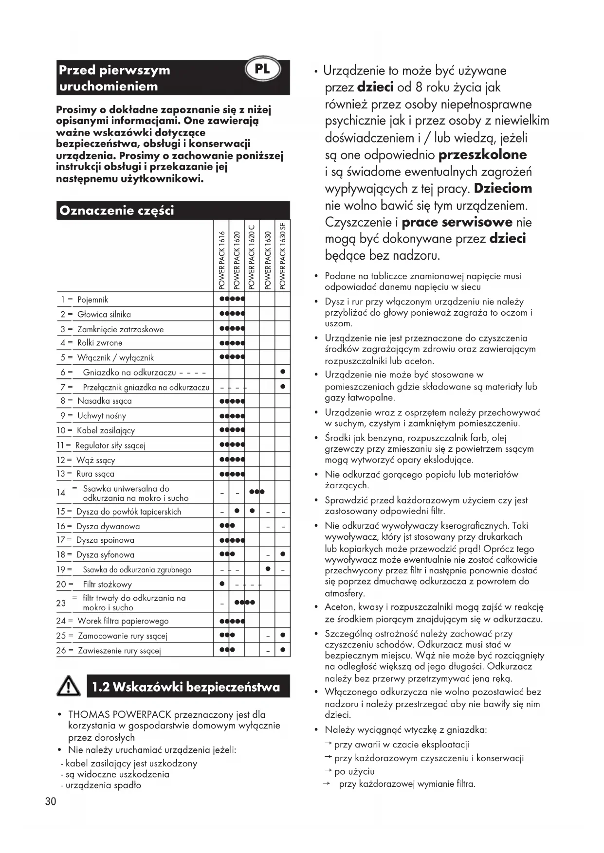 - Urządzenia elektryczne należy składować wg lokalnych zaleceń ale zanim oddasz urządzenie odetnij od niego wtyczkę Oznaczenie na produkcie lub jego opakowaniu oznacza, że nie może być one traktowane jak inne śmieci. Zużyte urządzenie należy oddać do wyznaczonego punktu zbiórki surowców wtórnych zajmującego się recyclingiem urządzeń elektrycznych. Stosując się do zasad recyclingu urządzeń elektrycznych pomożesz uniknąć potencjalnych negatywnych skutków dla środowiska i zdrowia ludzkiego jakie mogą być związane z niewłaściwym sposobem utylizacji tego urządzenia. W celu uzyskania więcej informacji na temat recyclingu tego urządzenia skontaktuj się lokalnym wydziałem ochrony środowiska, punktem recyclingu urządzeń elektrycznych lub ze sklepem gdzie nabyłeś ten produkt. Serwis Prosimy zwrócić się do sprzedawcy, który poda adres lub telefon przynależnego zakładu serwisowego THOMAS. Należy przy tam podać dane zapisane na tabliczce typu odkurzacza. W celu zachowania bezpiecznego funkcjonowania odkurzacza należy wszelkie naprawy, a w szczególności naprawy części prądowych dokonywać w zakładzie elektroserwisowym. W przypadku awarii należy się zwrócić do sprzedawcy lub zakładu serwisowego THOMAS. Dane kontaktowe znajdują się na odwrotnej stronie.33 Перед первым пуском в эксплуатацию Пожалуйста, прочтите внимательно всю нижеследующую информацию. Она содержит важные указания относительно безопасности, использования и технического обслуживания прибора. Сберегайте данное руководство по эксплуатации и передайте его дальше новому пользователю. Обозначения POWER PACK 1616POWER PACK 1620POWER PACK 1620 CPOWER PACK 1630POWER PACK 1630 SE 1 = бак