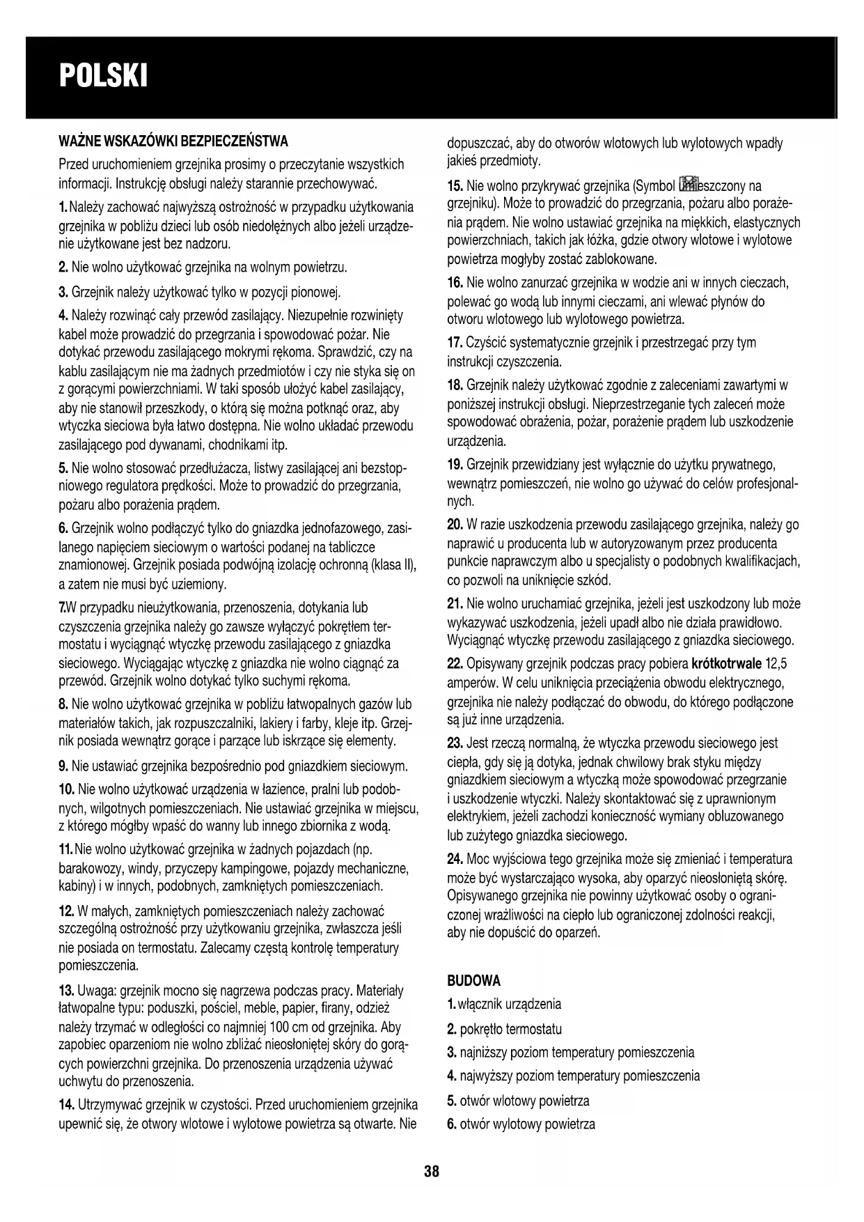 16. Nie wolno zanurzać grzejnika w wodzie ani w innych cieczach,