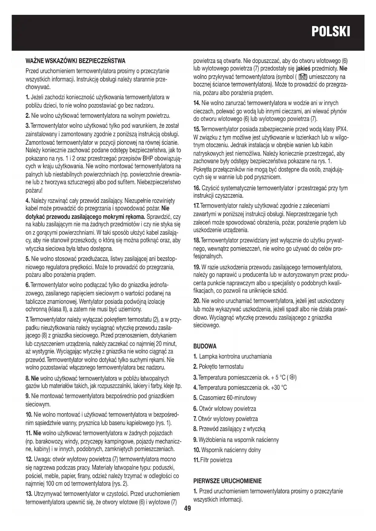 POLSKI WAŻNE WSKAZÓWKI BEZPIECZEŃSTWA Przed uruchomieniem termowentylatora prosimy o przeczytanie