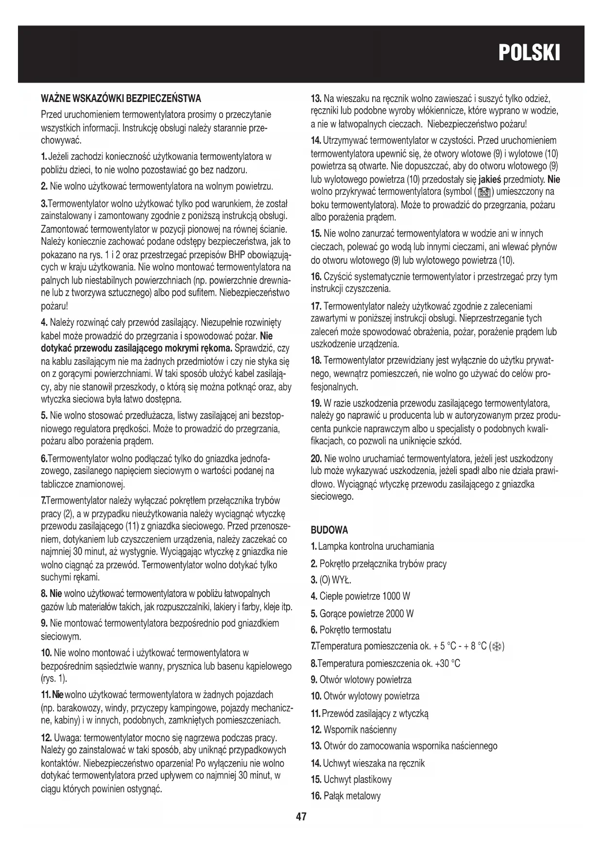 POLSKI WAŻNE WSKAZÓWKI BEZPIECZEŃSTWA Przed uruchomieniem termowentylatora prosimy o przeczytanie