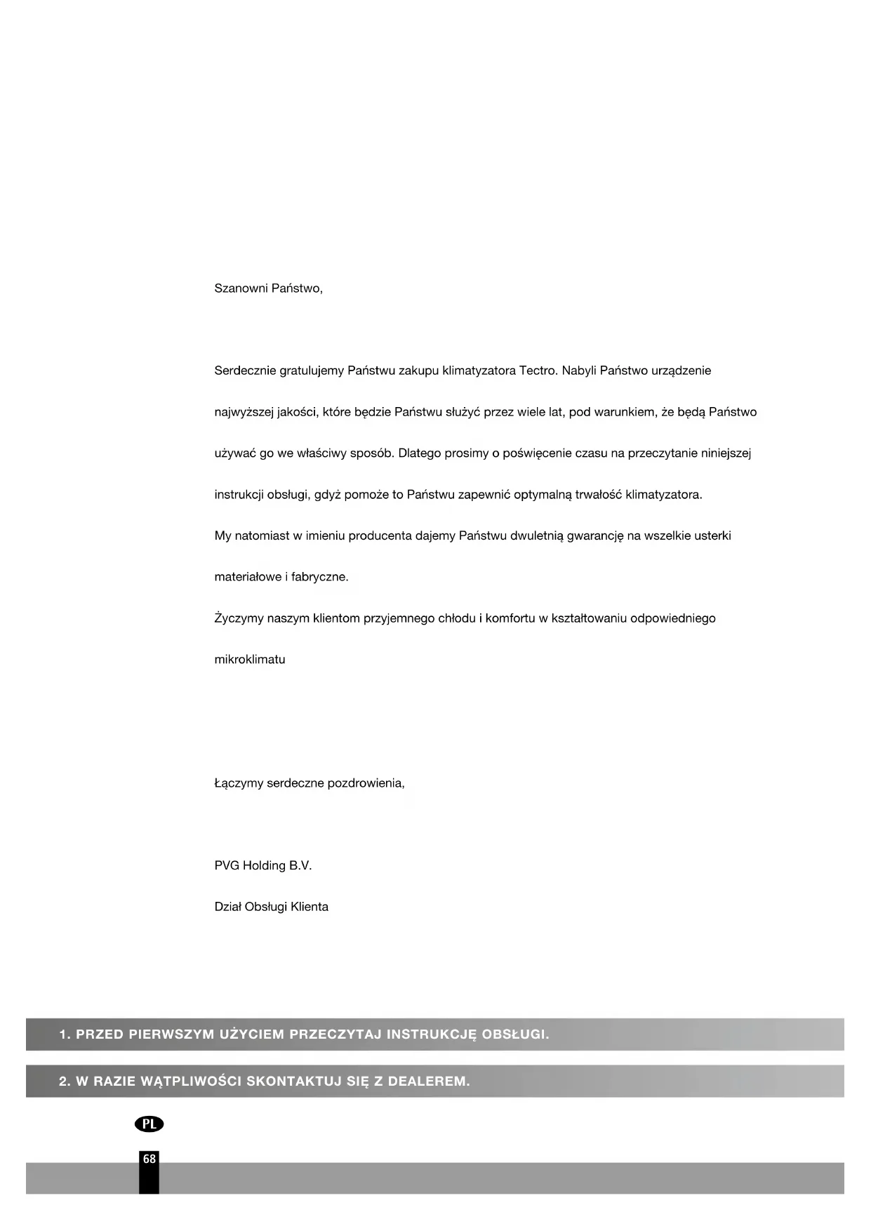 Szanowni Państwo, Serdecznie gratulujemy Państwu zakupu klimatyzatora Tectro. Nabyli Państwo urządzenie najwyższej jakości, które będzie Państwu służyć przez wiele lat, pod warunkiem, że będą Państwo używać go we właściwy sposób. Dlatego prosimy o poświęcenie czasu na przeczytanie niniejszej instrukcji obsługi, gdyż pomoże to Państwu zapewnić optymalną trwałość klimatyzatora. My natomiast w imieniu producenta dajemy Państwu dwuletnią gwarancję na wszelkie usterki materiałowe i fabryczne. Życzymy naszym klientom przyjemnego chłodu i komfortu w kształtowaniu odpowiedniego mikroklimatu Łączymy serdeczne pozdrowienia, PVG Holding B.V. Dział Obsługi Klienta 68: