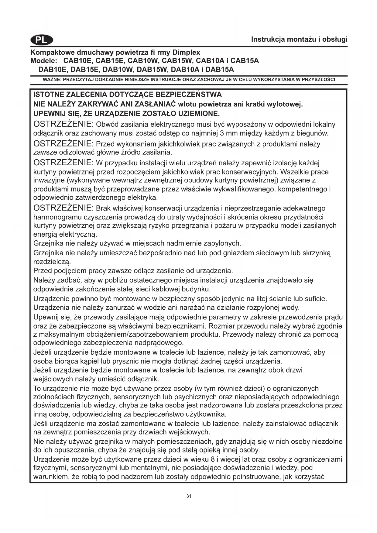 Instrukcja montażu i obsługi Kompaktowe dmuchawy powietrza fi rmy Dimplex Modele: CAB10E, CAB15E, CAB10W, CAB15W, CAB10A i CAB15A DAB10E, DAB15E, DAB10W, DAB15W, DAB10A i DAB15A WAŻNE: PRZECZYTAJ DOKŁADNIE NINIEJSZE INSTRUKCJE ORAZ ZACHOWAJ JE W CELU WYKORZYSTANIA W PRZYSZŁOŚCI