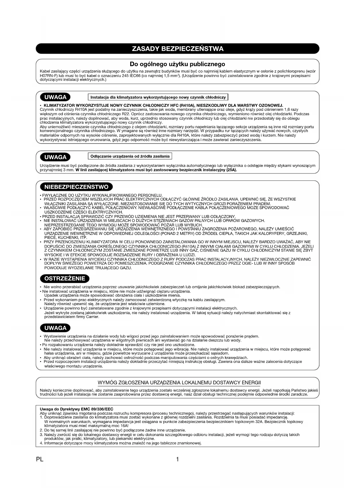 - Urządzenie powinno być zainstalowane zgodnie z krajowymi przepisami dotyczącymi instalacji elektrycznych. Jeżeli wykryte zostaną jakiekolwiek uszkodzenia, nie należy instalować urządzenia. W takiej sytuacji należy natychmiast skontaktować się z przedstawicielem firmy Carrier. UWAGA