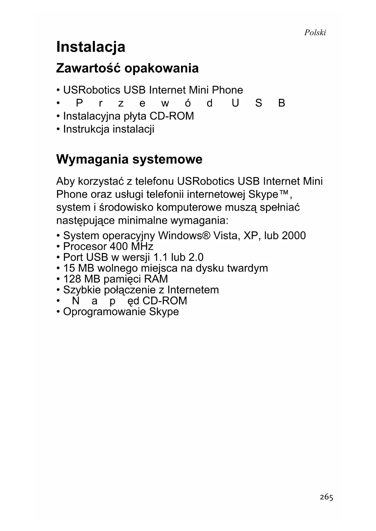 - Instrukcja instalacji Wymagania systemowe Aby korzystać z telefonu USRobotics USB Internet Mini Phone oraz usługi telefonii internetowej Skype™, system i środowisko komputerowe muszą spełniać następujące minimalne wymagania:
