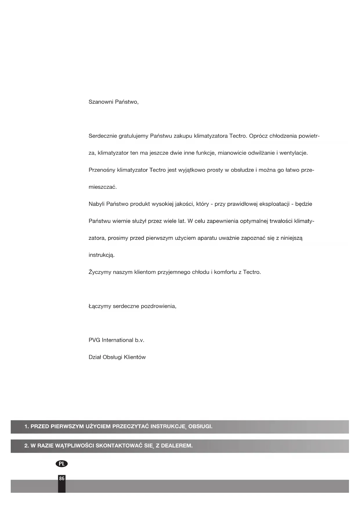 Szanowni Państwo, Serdecznie gratulujemy Państwu zakupu klimatyzatora Tectro. Oprócz chłodzenia powietr- za, klimatyzator ten ma jeszcze dwie inne funkcje, mianowicie odwilżanie i wentylacje. Przenośny klimatyzator Tectro jest wyjątkowo prosty w obsłudze i można go łatwo prze- mieszczać. Nabyli Państwo produkt wysokiej jakości, który - przy prawidłowej eksploatacji - będzie Państwu wiernie służył przez wiele lat. W celu zapewnienia optymalnej trwałości klimaty- zatora, prosimy przed pierwszym użyciem aparatu uważnie zapoznać się z niniejszą instrukcją. Życzymy naszym klientom przyjemnego chłodu i komfortu z Tectro. Łączymy serdeczne pozdrowienia, PVG International b.v. Dział Obsługi Klientów: