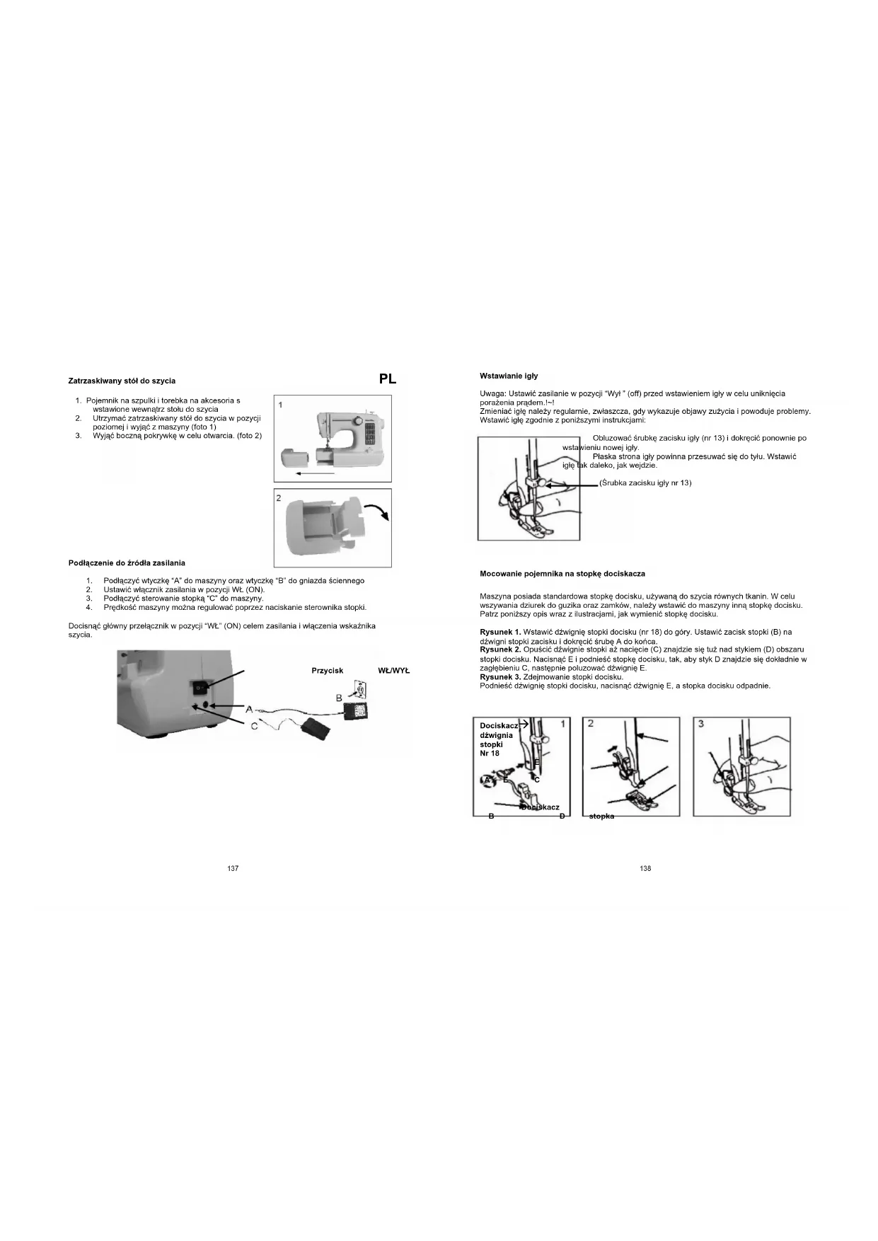 Mocowanie pojemnika na stopkę dociskacza Maszyna posiada standardowa stopkę docisku, używaną do szycia równych tkanin. W celu wszywania dziurek do guzika oraz zamków, należy wstawić do maszyny inną stopkę docisku. Patrz poniższy opis wraz z ilustracjami, jak wymienić stopkę docisku. Rysunek 1. Wstawić dźwignię stopki docisku (nr 18) do góry. Ustawić zacisk stopki (B) na dźwigni stopki zacisku i dokręcić śrubę A do końca. Rysunek 2. Opuścić dźwignie stopki aż nacięcie (C) znajdzie się tuż nad stykiem (D) obszaru stopki docisku. Nacisnąć E i podnieść stopkę docisku, tak, aby styk D znajdzie się dokładnie w zagłębieniu C, następnie poluzować dźwignię E. Rysunek 3. Zdejmowanie stopki docisku. Podnieść dźwignię stopki docisku, nacisnąć dźwignię E, a stopka docisku odpadnie.