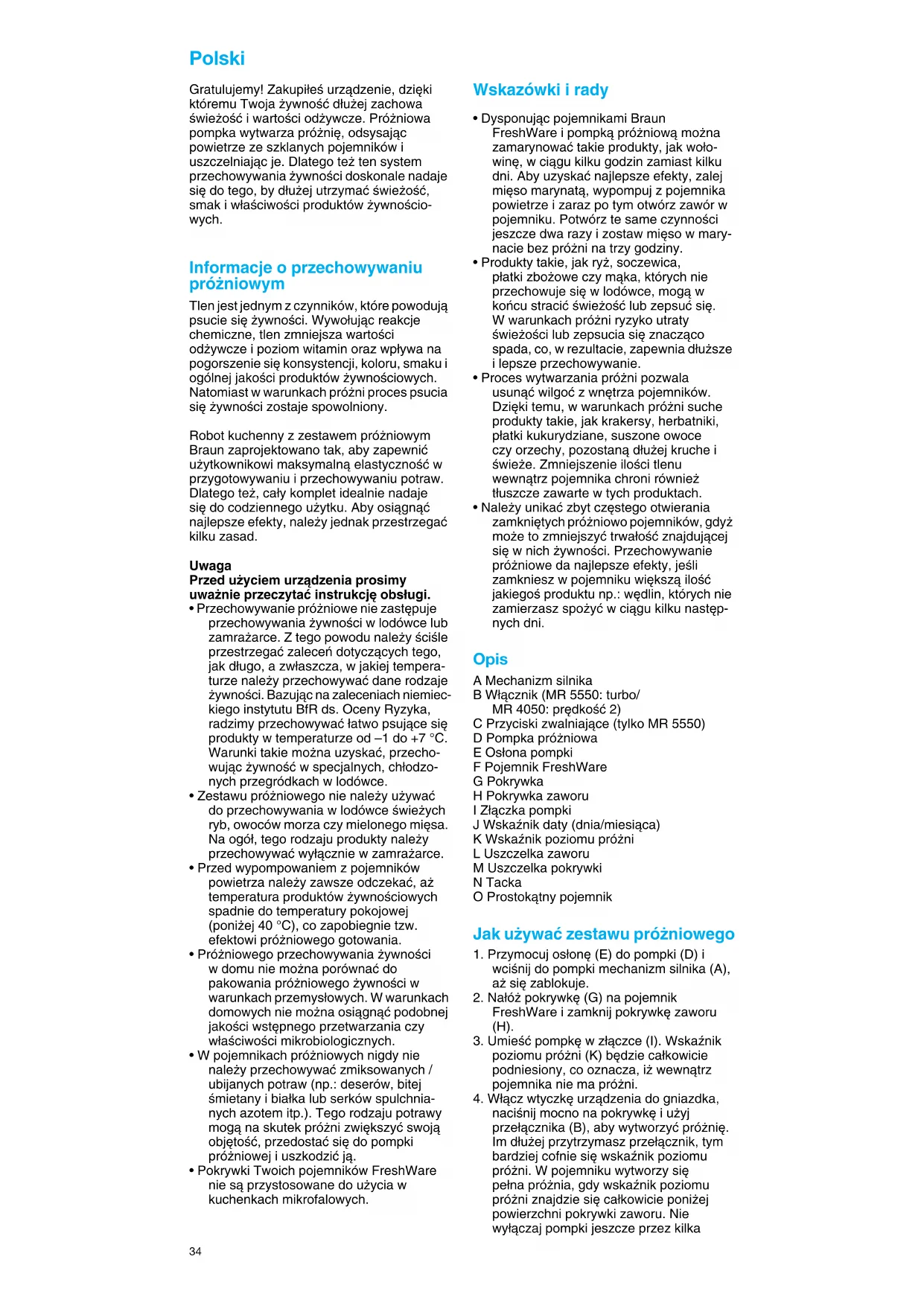 - Nale˝y unikaç zbyt cz´stego otwierania zamkni´tych pró˝niowo pojemników, gdy˝ mo˝e to zmniejszyç trwa∏oÊç znajdujàcej si´ w nich ˝ywnoÊci. Przechowywanie pró˝niowe da najlepsze efekty, jeÊli zamkniesz w pojemniku wi´kszà iloÊç jakiegoÊ produktu np.: w´dlin, których nie zamierzasz spo˝yç w ciàgu kilku nast´p- nych dni. Opis A Mechanizm silnika B W∏àcznik (MR 5550: turbo/ MR 4050: pr´dkoÊç 2) C Przyciski zwalniajàce (tylko MR 5550) D Pompka pró˝niowa E Os∏ona pompki F Pojemnik FreshWare G Pokrywka H Pokrywka zaworu I Z∏àczka pompki J Wskaênik daty (dnia/miesiàca) K Wskaênik poziomu pró˝ni L Uszczelka zaworu M Uszczelka pokrywki N Tacka O Prostokàtny pojemnik Jak u˝ywaç zestawu pró˝niowego