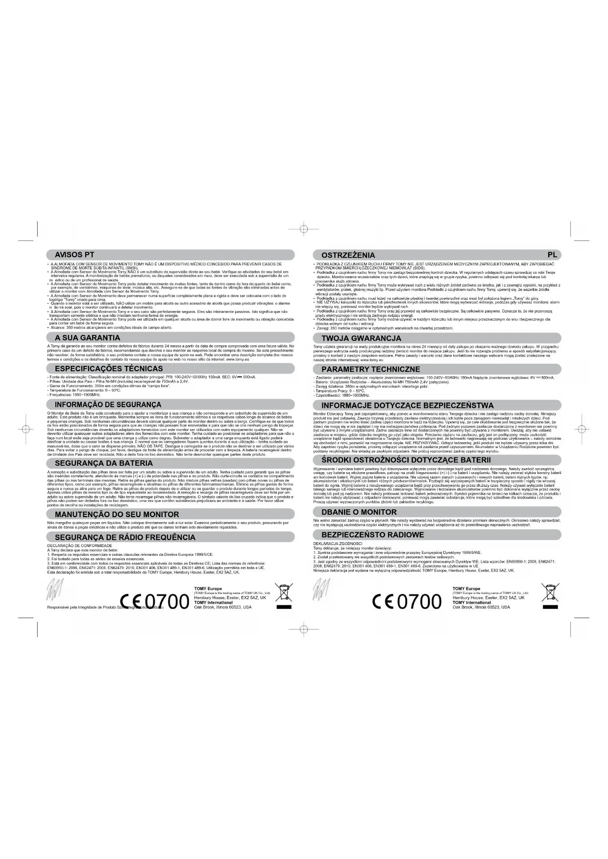 3. Jest zgodny ze wszystkimi odpowiednimi podstawowymi wymogami stosowanych Dyrektyw WE; Lista wzorców: EN60950-1: 2006, EN62471: 2008, EN62479: 2010, EN301 406, EN301 489-1, EN301 489-6. Zezwolono na użytkowanie w UE. Niniejsza deklaracja jest wydana na wyłączną odpowiedzialność TOMY Europe, Hembury House, Exeter, EX2 5AZ, UK. Monitor Dziecięcy Tomy jest zaprojektowany, aby pomóc w monitorowaniu stanu Twojego dziecka i nie zastąpi nadzoru osoby dorosłej. Niniejszy produkt nie jest zabawką. Zawsze trzymaj przedmioty zasilane elektrycznością i ich kable poza zasięgiem niemowląt i młodszych dzieci. Pod żadnym pozorem nie wolno kłaść żadnej części monitora w bądź na łóżeczku. Upewnij się, że całe okablowanie jest bezpiecznie ułożone tak, że dzieci nie mogą się w nie zaplątać i nie ma niebezpieczeństwa potknięcia. Pod żadnym pozorem zasilacze dostarczone z monitorem nie powinny być używane z innymi urządzeniami. Żadne zasilacze inne od dostarczonych nie powinny być używane z monitorem. Uważaj, aby nie ustawić zasilacza w miejscu, gdzie dziecko mogłoby go użyć jako stopnia. Położenie ciężaru na zasilaczu, gdy jest on podłączony, może uszkodzić urządzenie bądź spowodować obrażenia u Twojego dziecka. Normalnym jest, że ładowarki nagrzewają się podczas użytkowania – należy ostrożnie się obchodzić z nimi, pozwolić na rozproszenie ciepła. NIE PRZYKRYWAĆ. Odłącz ładowarkę, jeśli produkt nie będzie używany przez kilka dni. Aby zapobiec ryzyku porażenia, prosimy odłączyć urządzenie od zasilania przed czyszczeniem. Akumulator w Urządzeniu Rodziców powinien być poddany recyklingowi. Nie składuj ze zwykłymi odpadami. Nie próbuj rozmontować żadnej części tego wyrobu. Tomy udziela gwarancji na wady produkcyjne monitora na okres 24 miesięcy od daty zakupu po okazaniu ważnego dowodu zakupu. W przypadku pierwszego wykrycia wady produkcyjnej radzimy zwrócić monitor do miejsca zakupu. Jeśli to nie rozwiąże problemu w sposób satysfakcjonujący, prosimy o kontakt z naszym zespołem webcare. Pełne zasady i warunki oraz dane kontaktowe naszego webcare mogą zostać znalezione na naszej stronie internetowej: www.tomy.eu TWOJA GWARANCJA - Zasilanie: parametry zasilacza: napięcie znamionowe wejściowe: 100-240V~50/60Hz 150mA Napięcie znamionowe wyjściowe: 6V 500mA. - Baterie: Urządzenie Rodziców – Akumulatory Ni-MH 750mAh 2,4V (załączone). - Zasięg działania: 350m w optymalnych warunkach ‘otwartego pola’. - Temperatura Pracy: 0 – 50ºC. - Częstotliwości: 1880~1900MHz. AVISOS PT OSTRZEŻENIA